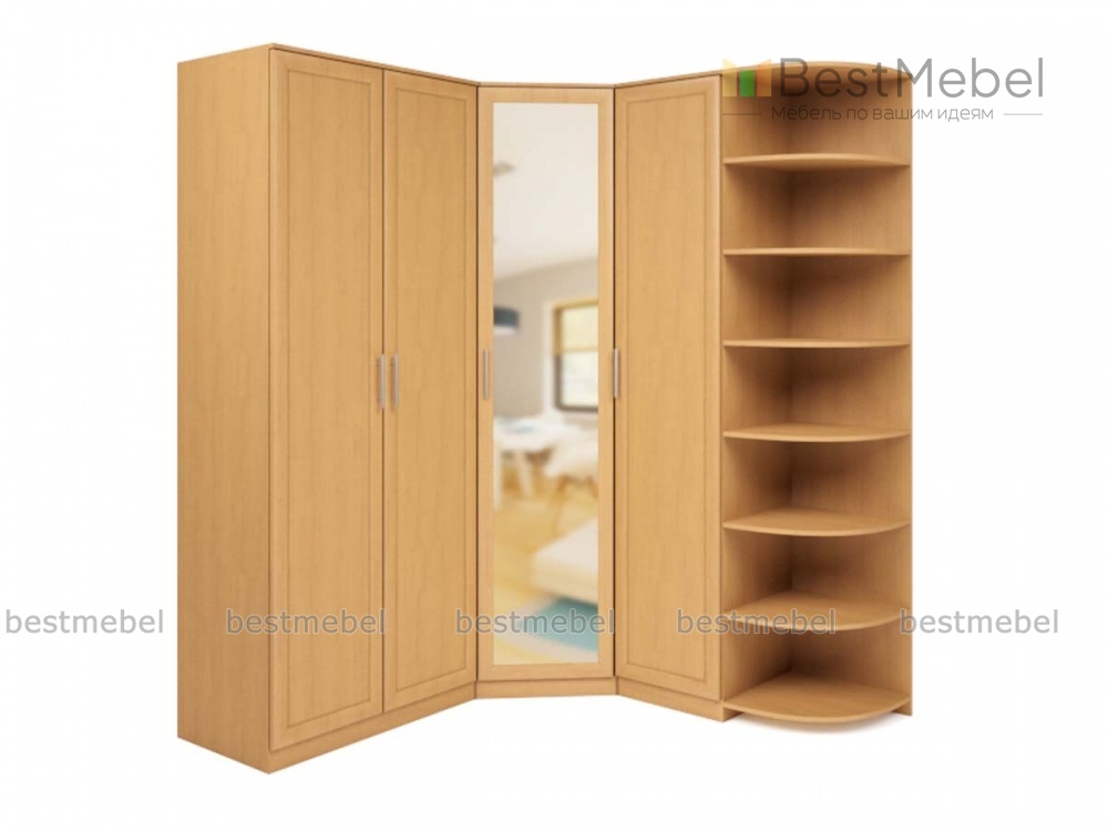 Шкаф угловой Меркурий 2 BMS представляет собой группу из углового однодверного шкафа, прямого двухдверного и пенала, дополненного торцевым стеллажом. Крупногабаритная распашная конструкция отличается вместительностью и позволит организовать удобное хранение одежды и домашнего текстиля, но при этом компактна за счет угловой формы. Классические рамочные фасады выполнены в древесных тонах, центральная дверца – зеркальная. Купить шкаф угловой Меркурий 2 BMS приглашаем в наш интернет-магазин.