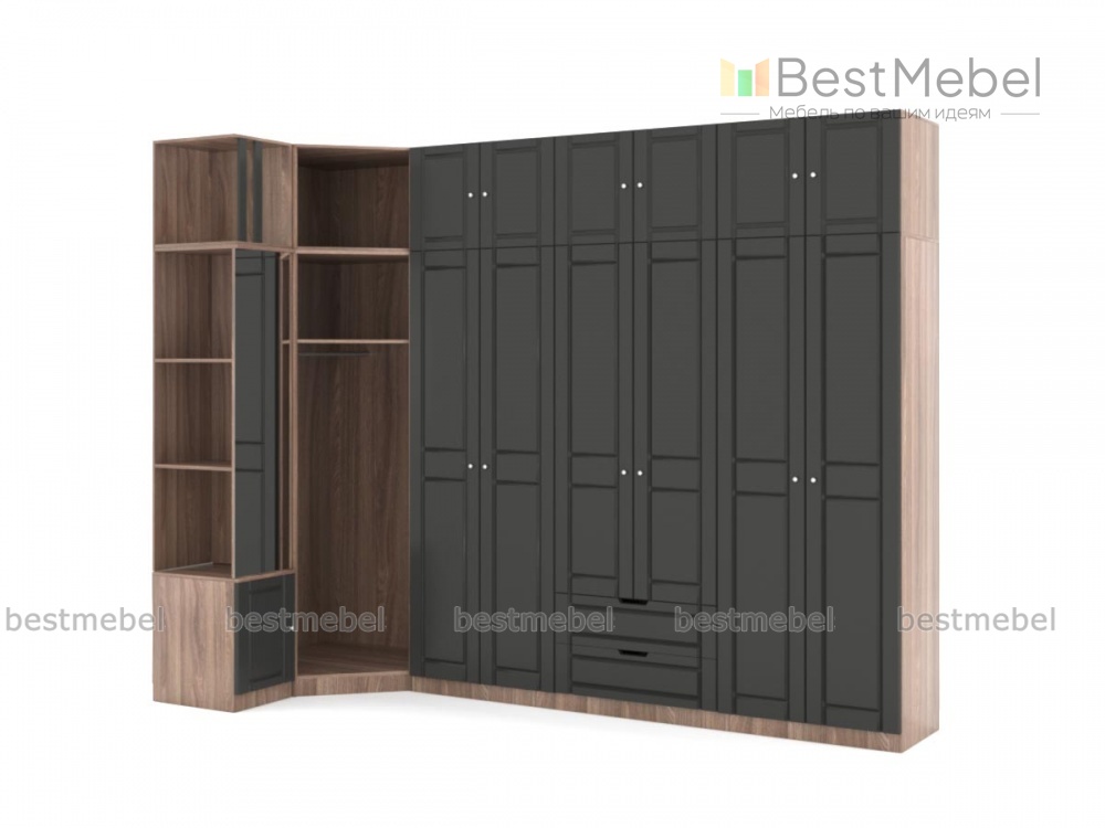 Шкаф угловой Перси 2 BMS отличается крупными габаритами, вместительностью и практичной Г-образной формой, которая позволяет эффективно использовать пространство. Многофункциональная модель оборудована распашными отделениями с полками и штангами, выдвижными ящиками, просторной распашной антресолью, а также открытым угловым отделением для одежды и секцией с тумбой и зеркалом, дополненным торцевыми полками под уходовые средства и аксессуары. Фрезерованные серые фасады скомбинированы с корпусом теплых древесных тонов. Купить шкаф угловой Перси 2 BMS приглашаем в наш интернет-магазин.