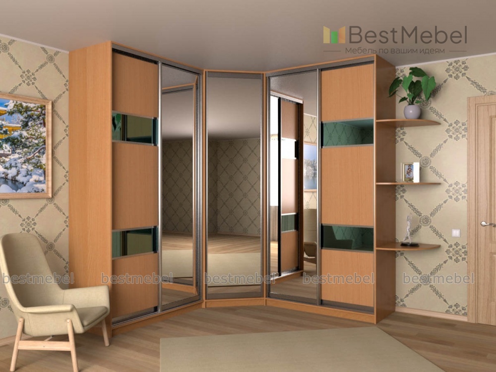 Угловой шкаф 47 BMS – это удобная система хранения для интерьера спальни или прихожей. Встроенная конструкция включает в себя распашной угловой шкаф с зеркальной дверцей, раздвижные двухдверные отделения и торцевой стеллаж с радиусными полками для уходовых средств и бытовых мелочей. Практичная модель эффективно использует пространство и экономит полезную площадь комнаты. Фасады современного дизайна выполнены в теплых древесных тонах и декорированы горизонтальными глянцевыми вставками контрастного цвета. Купить Угловой шкаф 47 BMS приглашаем в наш интернет-магазин.