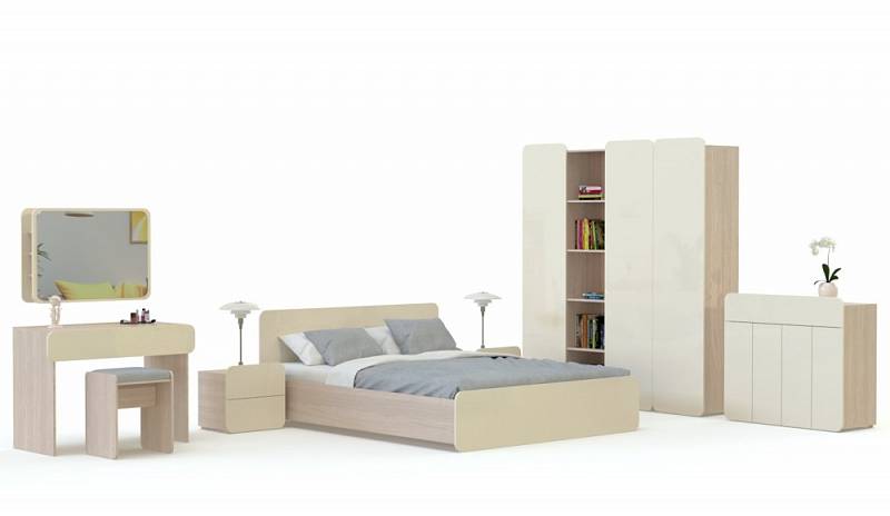 Основное отличие спальни Беж BMS – легкость, ненавязчивость и лаконичность дизайна. В комплекте имеется все необходимое для создания комфортной жизни, уютной обстановки, бережного хранения домашних вещей, соблюдения порядка. В набор входят двуспальная кровать с прикроватной тумбочкой, компактный комод с выдвижными ящиками, туалетный столик оригинальным настенным зеркалом и милым пуфиком и шкаф. Нарядная мебель выполнена в едином стиле, имеет теплые оттенки натурального дерева в сочетании с белоснежными закругленными фасадами. Шкаф имеет универсальное назначение, оборудован отделением для одежды и витриной. Предлагаем купить в нашем интернет-магазине качественную долговечную спальню Беж BMS по доступной цене, с возможностью выбора параметров и комплектации.