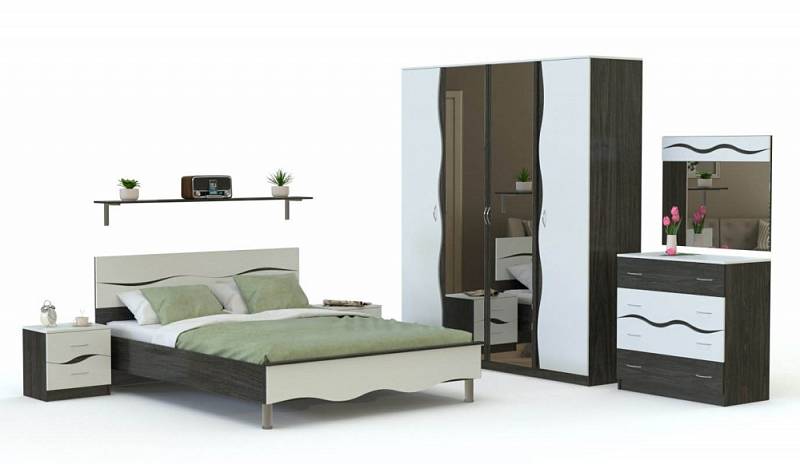 Спальня Гардония 1 BMS привлекает внимание необычным декором фасадов. Выполненные в контрастной гамме и украшенные волнообразными вырезами, они сделают интерьер запоминающимся. Спальня оборудована двуспальной кроватью с высокими ножками в оттенке хром, прикроватными тумбами, вместительным бельевым комодом, навесным панно с зеркалом и четырехдверным шкафом с полками и штангой. Зеркальные дверцы не только практичны, но и добавят помещению недостающий объем. Купить спальню Гардония 1 BMS вы сможете в нашем интернет-магазине.