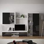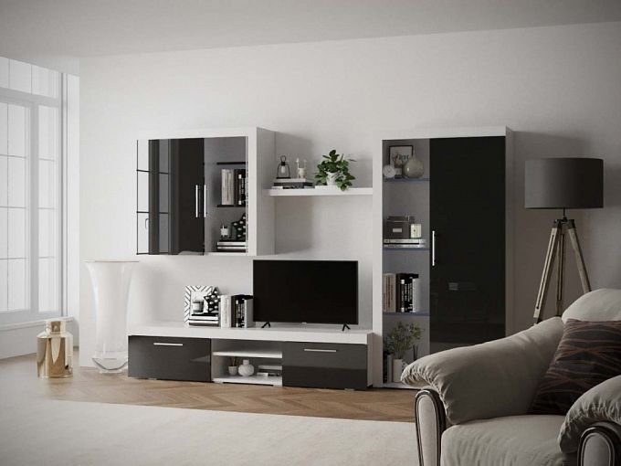 Практичный и стильный подход к организации пространства современной гостиной – модель Samba B BMS. Для комфортного пользования комплект оборудован вместительными и функциональными модулями – тумбой под ТВ, напольным и навесным комбинированными с витринами шкафами и открытой полкой. Такая конструкция позволит разместить технику, книги, предметы гардероба и прочие домашние вещи. Эффектные глянцевые фасады в черно-белой гамме отличаются практичностью и долговечностью.