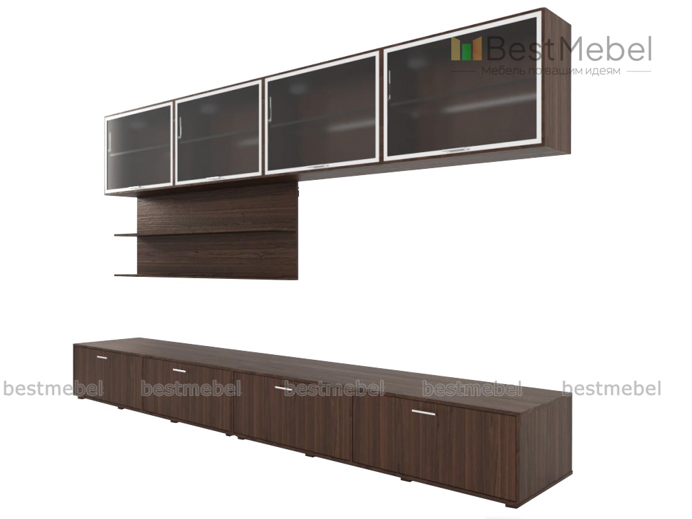 Экстраординарная и необычная мебель сразу бросается в глаза. С помощью этой модели Вы сможете создать оригинальный интерьер комнаты и подчеркнуть свой изысканный вкус. Стенка Фиджи-4 представляет собой два отдельных блока. Нижний блок состоит из приземистых больших тумб. Верхний блок представляет собой 4 большие тумбочки под матовым стеклом и с боку 2 открытые полки. Все это смотрится очень гармонично и стильно. Купить модель можно для гостиной или квартиры студии.