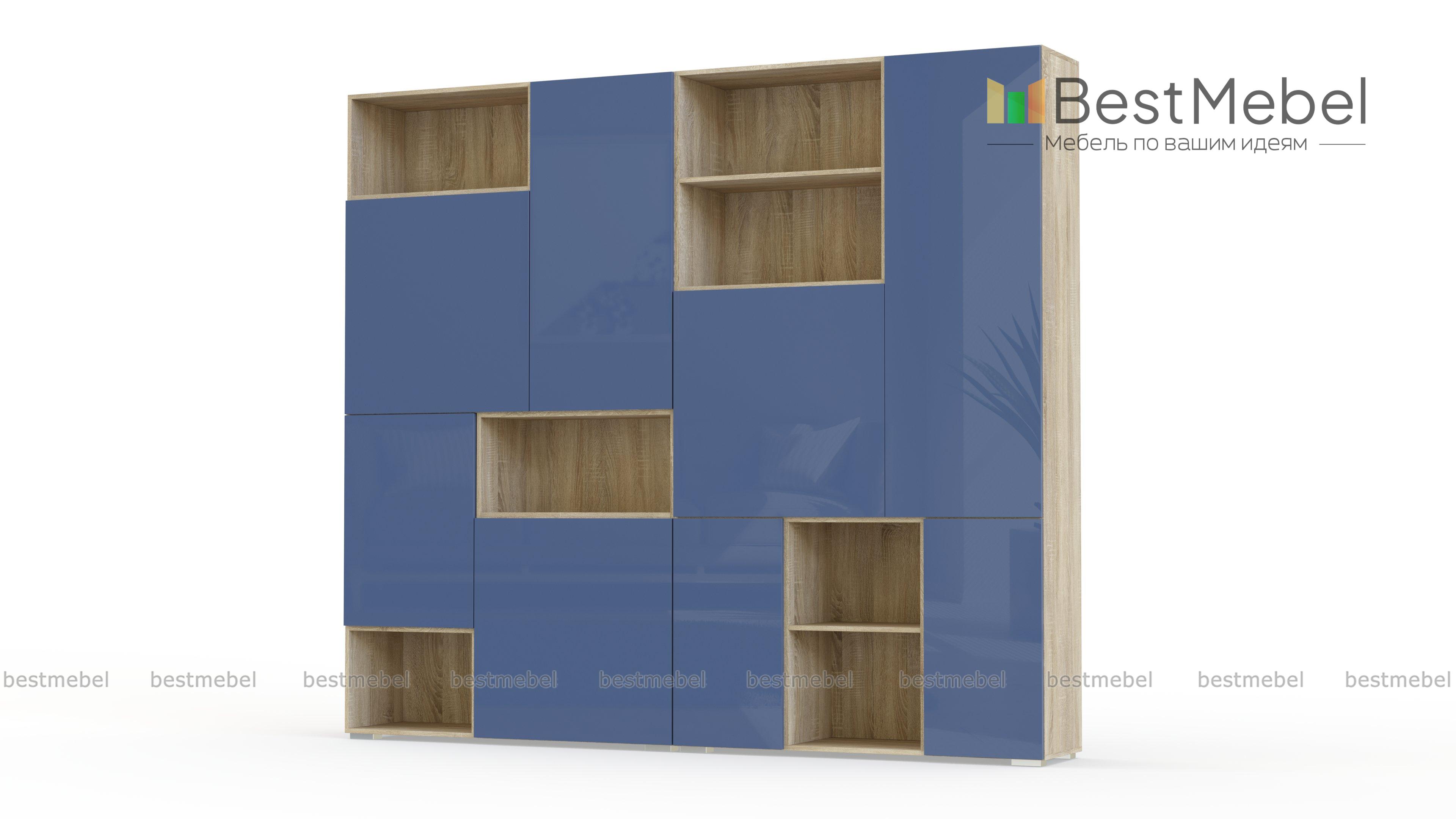 Стенка для гостиной Мей 3 BMS включает в себя два комбинированных шкафа и привлекает стильной геометрией линий. Оригинальная композиция с корпусом в белых тонах и цветным фасадом станет отличным дополнением современных минималистичных интерьеров. Для удобного хранения домашнего текстиля, разнообразных бытовых мелочей, книг и предметов декора стенка оборудована распашными отделениями разных размеров и просторными нишами. Купить стенку для гостиной Мей 3 BMS приглашаем в наш интернет-магазин.