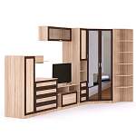 Стенка Эйс 6 BMS – это продуманная до мелочей модульная композиция для интерьера современной гостиной или спальни. Корпус светлого древесного оттенка в сочетании с темным рамочным фасадом смотрится нестандартно, а визуальную легкость композиции придают застекленные и зеркальные дверцы. В комплект входят угловой шкаф для одежды с торцевым радиусным стеллажом, комбинированный шкаф, тумба под ТВ, навесные полки, витрина и вместительный комод. Купить стенку Эйс 6 BMS и легко поддерживать дома порядок вам поможет наш интернет-магазин.