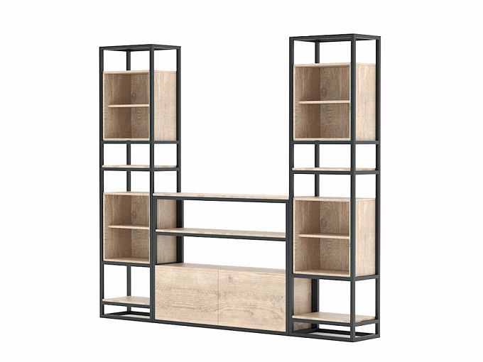 Стенка Финист 50 BMS поможет оборудовать телезону в актуальных интерьерах с элементами стиля лофт. Композиция включает в себя широкую тумбу с нишами и закрытым отделением и симметрично расположенные стеллажи с открытыми полками. Простая и функциональная конструкция позволит разместить аппаратуру, предметы декора, книги и сопутствующие аксессуары. Выполненная в древесных тонах стенка располагается на металлокаркасе. Купить стеллаж Финист 50 BMS приглашаем в наш интернет-магазин по доступной цене.