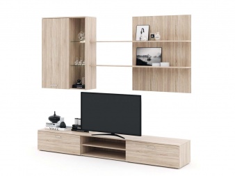 Стенка Камелот BMS оформит телезону в современной эстетике. Напольная часть представлена широкой низкой тумбой с выдвижными ящиками и нишами под аппаратуру, а навесная - композицией из распашного шкафа со стеклополками и книжных полок, закрепленных на геометричной панели. Древесный рисунок модулей универсален, а особенную выразительность декоративным мелочам придаст встроенная подсветка. Купить стенку Камелот BMS приглашаем в наш интернет-магазин с выбором цвета по каталогу.