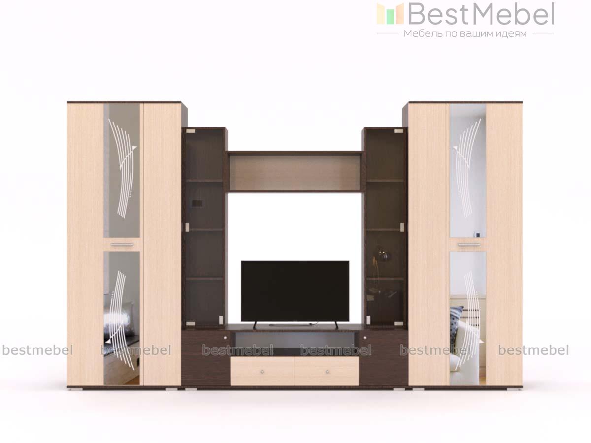 Стенка Мега 15 BMS смотрится необыкновенно эффектно в контрастных древесных тонах с фигурно вырезанной задней стенкой. Композиция для современной гостиной позволит создать не только функциональный, но и запоминающийся интерьер. В центре стенки располагается телезона с широкой низкой тумбой под аппаратуру, витринами и открытыми книжными полками, а по бокам – распашные шкафы для одежды и домашнего текстиля. Створки шкафов декорированы зеркальными вставками с пескоструйным рисунком. Купить стенку Мега 15 BMS приглашаем в наш интернет-магазин.
