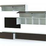 Стенка - что надо. Минимализм рулит. Дополнительно заказали еще один напольный шкаф, панель за телевизор. Перевернули два верхних длинных шкафа. Теперь открываются как секретер.