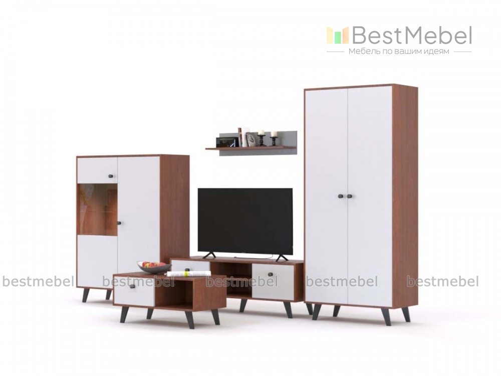 Стенка Север 5 BMS позволит создать комфортный и стильный интерьер, отвечающий современным мебельным тенденциям. Модульная коллекция для гостиной включает в себя широкую низкую ТВ-тумбу, высокую тумбу с витриной, распашной платяной шкаф и журнальный столик с просторной прямоугольной столешницей, ящиком и нишей. Выполненные в сочетании насыщенных древесных оттенков и белого, предметы располагаются на высоких устойчивых ножках. Купить стенку Север 5 BMS приглашаем в наш интернет-магазин.