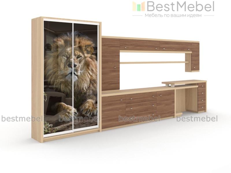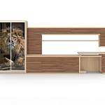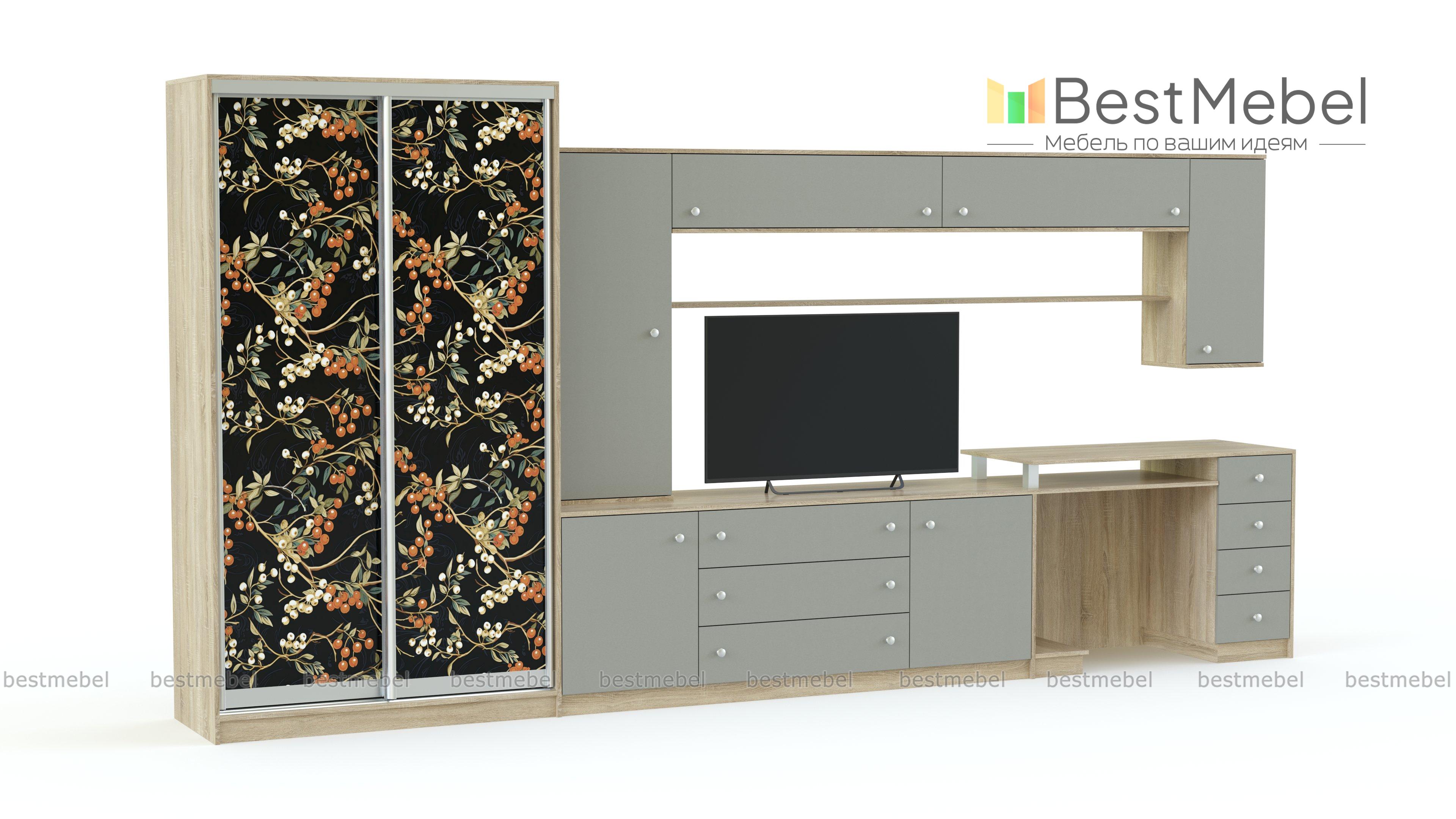 Стенка в гостиную Техно 11 BMS – многофункциональная современная модель, объединившая удобную систему хранения, зону ТВ и комфортное рабочее место. Шкаф-купе с растительной фотопечатью на фасаде гармонично дополняют тумба под аппаратуру, компьютерный стол и навесные элементы, выполненные в модной бежевой гамме с имитацией древесной текстуры. Сочетание эргономичности и креатива станет лучшим выбором для интерьера современной гостиной. Купить стенку в гостиную Техно 11 BMS по отличной цене приглашаем в наш интернет-магазин.