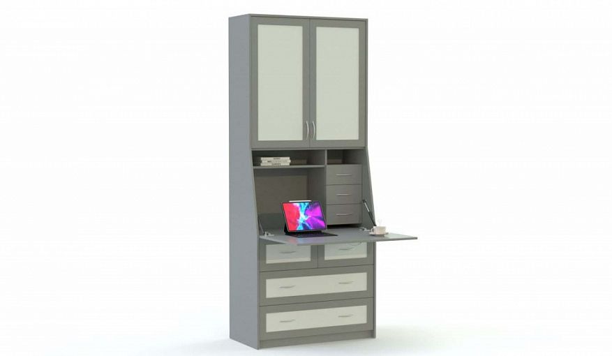 Компьютерный стол-трансформер Фимона 1 BMS – это элегантный секретер для тех, кто предпочитает классические решения. Высокая модель с рамочными фасадами выполнена в универсальных серо-белых тонах и оборудована удобной системой хранения из распашного отделения с полками и четырех выдвижных ящиков. За откидной столешницей в центральной части скрыты ниши и ящички для мелочей. Купить компьютерный стол-трансформер Фимона 1 BMS для работы или учебы вы сможете в нашем интернет-магазине.