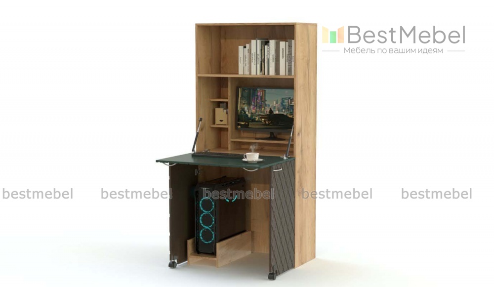 Компьютерный стол-трансформер Ольви 3 BMS украсит современный интерьер и сэкономит полезную площадь. Корпус, выполненный в теплых крафтовых тонах, скомбинирован с фрезерованным ромбами цветным фасадом. Трансформер оборудован просторной книжной полкой в верхней части, откидной столешницей, за которой скрыты ниша под монитор и стеллаж, опорными створками на колесиках и подставкой под системный блок. Купить компьютерный стол-трансформер Ольви 3 BMS для яркого и функционального интерьера вы сможете в нашем интернет-магазине.