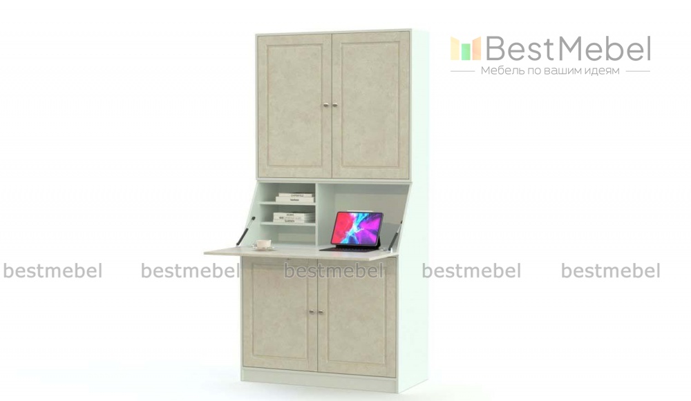 Компьютерный стол-трансформер Сара 3 BMS поможет вам оборудовать полноценное рабочее место в интерьере спальни или гостиной. Модель с откидной столешницей и двумя двухдверными распашными отделениями вы сможете использовать как книжный шкаф или превратить в стол. Светлый фасад шкафа с имитацией поверхности камня отличается долговечностью и износостойкостью. Купить компьютерный стол-трансформер Сара 3 BMS и сэкономить пространство вам всегда поможет наш интернет-магазин.