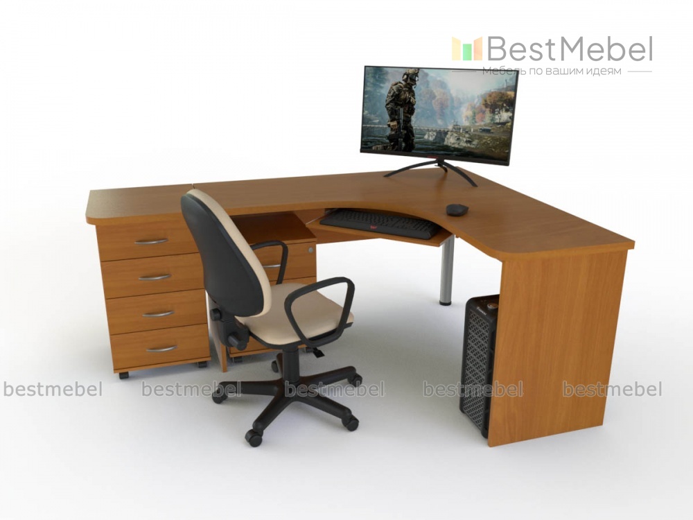 Компьютерный стол угловой Руссо BMS оборудован всем необходимым для комфортной работы или учебы. Модель с эргономичным вырезом столешницы дополнена выкатной панелью для клавиатуры, мобильной тумбой с замком для хранения канцелярских принадлежностей и документов и приставным элементом с тумбой на колесных опорах. Лаконичный и выполненный в древесных тонах, стол универсален для современных интерьеров. Купить компьютерный стол угловой Руссо BMS по доступной цене вы сможете в нашем интернет-магазине.