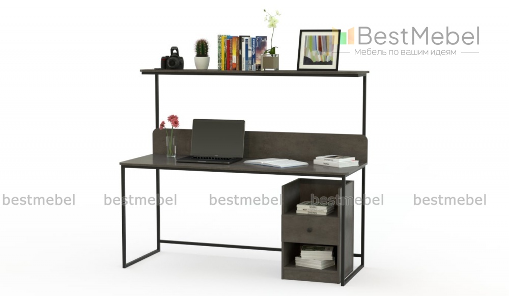 Компьютерный стол Виста 11 BMS отличается лаконичным дизайном при высоком уровне функциональности. Модель, выполненная в темно-серых тонах с имитацией бетонной поверхности, оборудована столешницей с высокой задней стенкой, которая предотвратит падение предметов, узкой верхней полкой для размещения важных мелочей или элементов декора и отдельной тумбой с выдвижным ящиком и двумя открытыми полками для книг. Купить компьютерный стол Виста 11 BMS с выбором цвета по каталогу вы можете в нашем интернет-магазине.