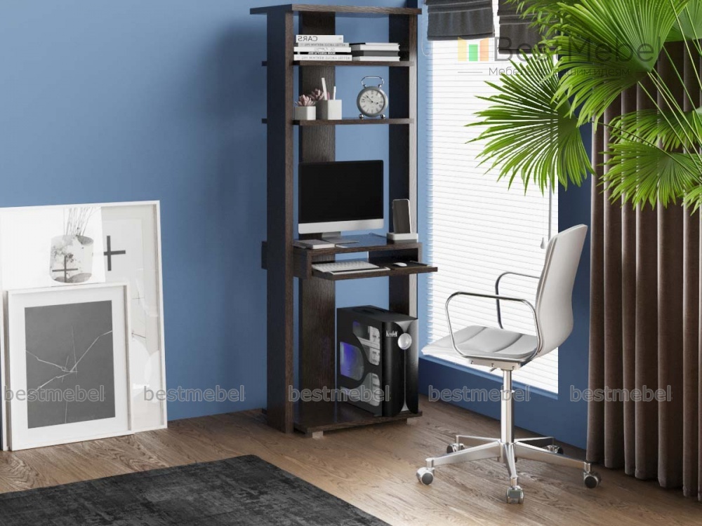 Модель очень оригинальная, предназначена для оборудования рабочего места, при значительной экономии свободного пространства. Стол представляет собой высокую тумбу оригинальной формы. Небольшое рабочее место вполне комфортное. Компьютерный стол КС 20-38 BMS имеет дополнительно две большие полки, на которых комфортно разместятся диски, книги и т.д. Купить такую модель вы можете, изменив изначальные параметры модели и подобрав цвет под остальную обстановку.