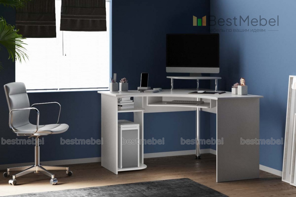 Стол угловой компьютерный Myau СУ-8 BMS выглядит очень легко, почти невесомо, благодаря белоснежному цвету, отсутствию тумбы и многочисленных отделений. Но он не утрачивает от этого своих высоких потребительских свойств. На широкой столешнице найдется место для различных документов, установки принтера, сканера, факса. Монитор уютно устроится на специальной подставке, а клавиатура найдет свое место под рабочей зоной на выкатывающейся полочке. Системный блок будет покоиться в хорошо вентилируемом отсеке, специально оборудованном внизу модели. Никелированные трубки, примененные для поддержки одного из углов столешницы и подставки монитора, придают изделию стильный вид. Заказать удобный в использовании, качественный и совсем недорогой стол вы можете на нашем сайте.