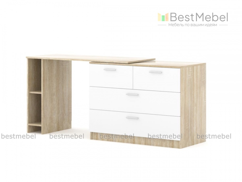 Стол компьютерный Парус 14 BMS в сложенном виде представляет собой вместительный комод, а при необходимости легко трансформируется. Модель, оборудованная двумя большими выдвижными ящиками, двумя малыми и открытыми боковыми секциями, оптимальна для хранения большого количества вещей. С помощью поворотного механизма вы получаете прямой стол с просторной рабочей поверхностью или угловой. Купить стол компьютерный Парус 14 BMS приглашаем в наш интернет-магазин с выбором цвета и фурнитуры по каталогу.