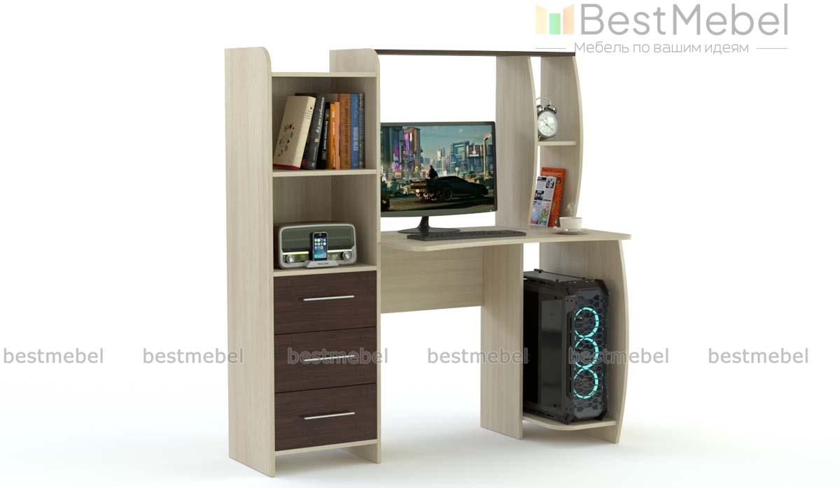 Красивый стол с современными формами, стильными ручками и очень интересным цветовым решением. Стол очень удобный для работы и имеет много места для расположения всей необходимой компьютерной техники. Кроме этого, имеется большая тумба с тремя выдвижными ящичками и открытые ниши, где можно поместить множество книг, дисков, бумаг. Полки очень интересной формы. Стол компьютерный Школьник-Класс М BMS можно купить для солидного офиса, кабинета или в комнату подроста.
