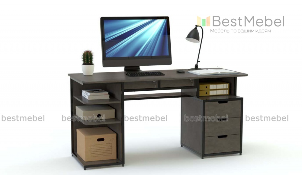 Стол компьютерный Виктор 5 BMS – это трендовый дизайн в индустриальном стиле и продуманный функционал. Модель с брутальным характером выполнена из ЛДСП с имитацией поверхности камня и металла, отличаясь прочностью и долговечностью. Для удобного размещения монитора, канцелярских принадлежностей и бумаг стол оборудован просторной прямоугольной столешницей, открытыми полками, тумбой с выдвижными ящиками и отделениями, закрывающимися на ключ. Купить стол компьютерный Виктор 5 BMS вы сможете на сайте нашего интернет-магазина.