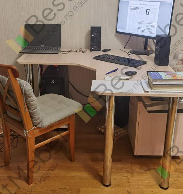 Стол удобный! Вмещает 2 монитора 21 с небольшим совершенно спокойно(размер 1100х1100) . Удобный вырез для залечь под стол и ножки положить(фото 3-4) .Подставка под монитор крайне удобная, нет никаких перемычек, спокойно можно присоединять провода ( фото 2). Кресло можно задвинуть. Тумба на колесах , можно закатить под стол , можно рядом. У меня рядом , еще дополнительное рабочее пространство. Размер можно заказать , у меня небольшая комната, влезло до сантиметра. Сборка легкая , нет сложных и громоздких элементов.