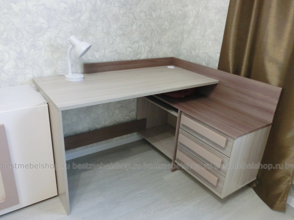 Оригинальная модель письменный угловой стол ОМ-1 BMS представляет собой необычное сочетание письменного стола и вместительного комбинированного модуля. Модуль оборудован выдвижной полкой для клавиатуры, просторным открытым отделением и тремя выдвижными ящиками для мелочей. Угловая конструкция делает этот стол подходящим даже для небольших помещений, а нейтральная расцветка легко впишется в современный интерьер комнаты подростка или офис. Изготовленная из материалов высокого качества, эта модель будет долго служить вам.