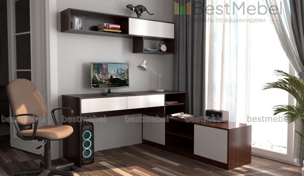 Письменный стол Санди 1 BMS сочетает в себе модный минимализм и высокую функциональность. Угловая композиция, включающая в себя письменный стол с выдвижными ящиками и нишами, широкую опорную тумбу и навесные книжные полки, позволяет разместить в зоне быстрого доступа канцелярские принадлежности, книги, оргтехнику и многое другое. Корпус темного оттенка дополняют белые гладкие фасады. Купить письменный стол Санди 1 BMS вы сможете в нашем интернет-магазине.