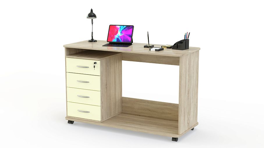 Письменный стол Юниверс 9 BMS с корпусом темных древесных тонов и голубым глянцевым фасадом с оттенком металлик гармонично впишется в интерьер комнаты современного подростка. Передвижная модель оборудована просторной прямоугольной столешницей, основанием с колесиками и тумбой с четырьмя выдвижными ящиками для хранения канцелярских принадлежностей. Купить письменный стол Юниверс 9 BMS и обустроить комфортную рабочую зону вам всегда поможет наш интернет-магазин.
