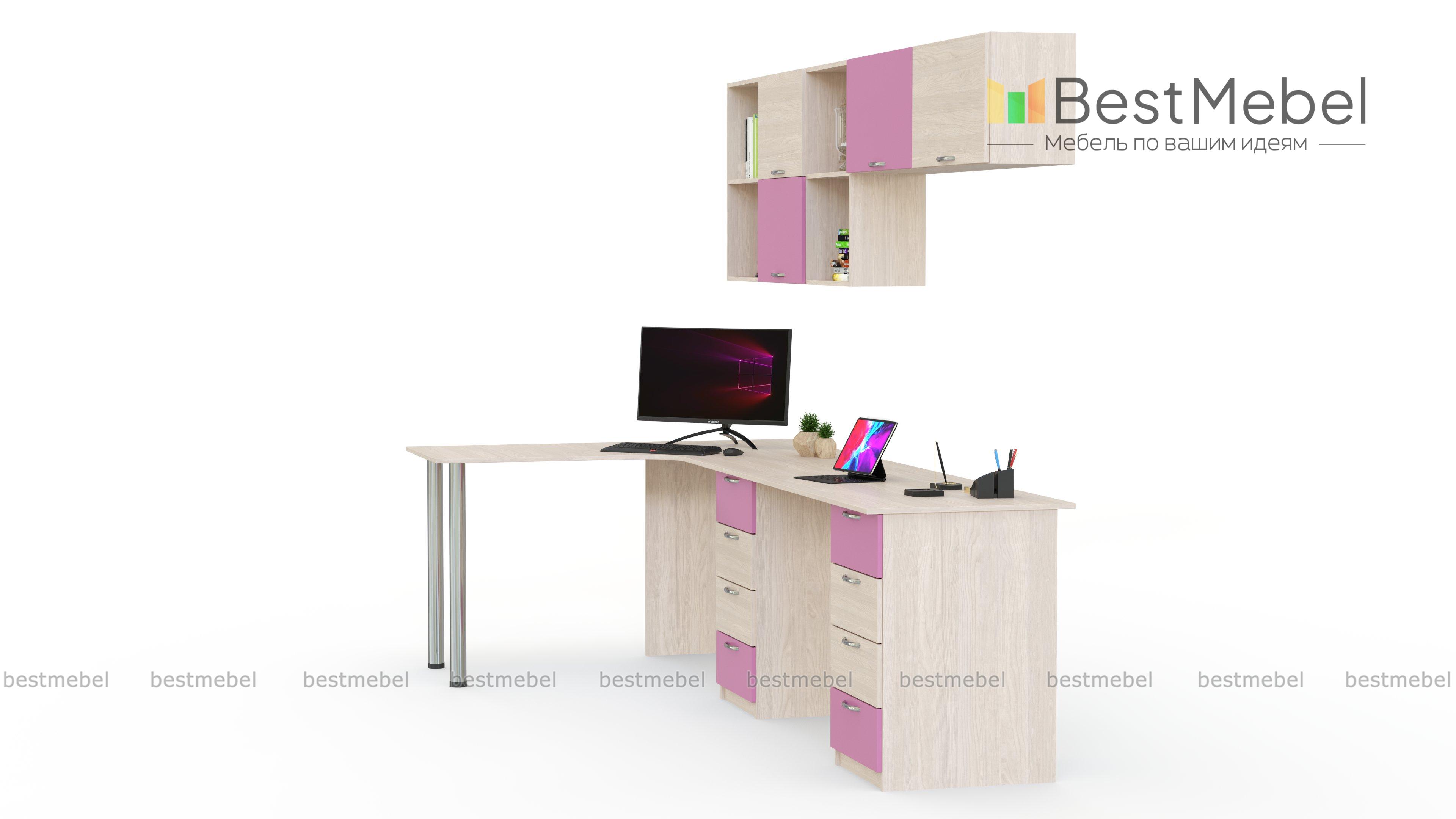Угловой письменный стол для двоих Виктория 20 BMS имеет практичную Г-образную форму, позволяющую сэкономить пространство. Выполненная в сочетании светлых древесных тонов корпуса и контрастных фасадов, композиция гармонично впишется в интерьер детской. Для удобного хранения канцелярских мелочей, учебных материалов и принадлежностей для творчества предусмотрены две тумбы с выдвижными ящиками и навесная книжная полка. Купить угловой письменный стол для двоих Виктория 20 BMS вы всегда сможете в нашем интернет-магазине.