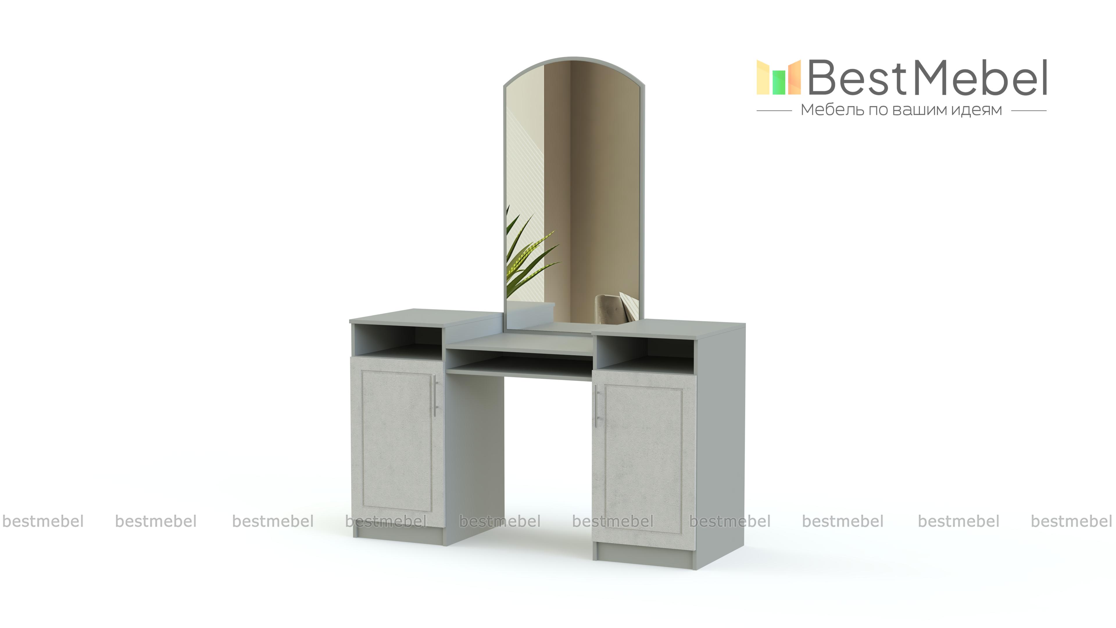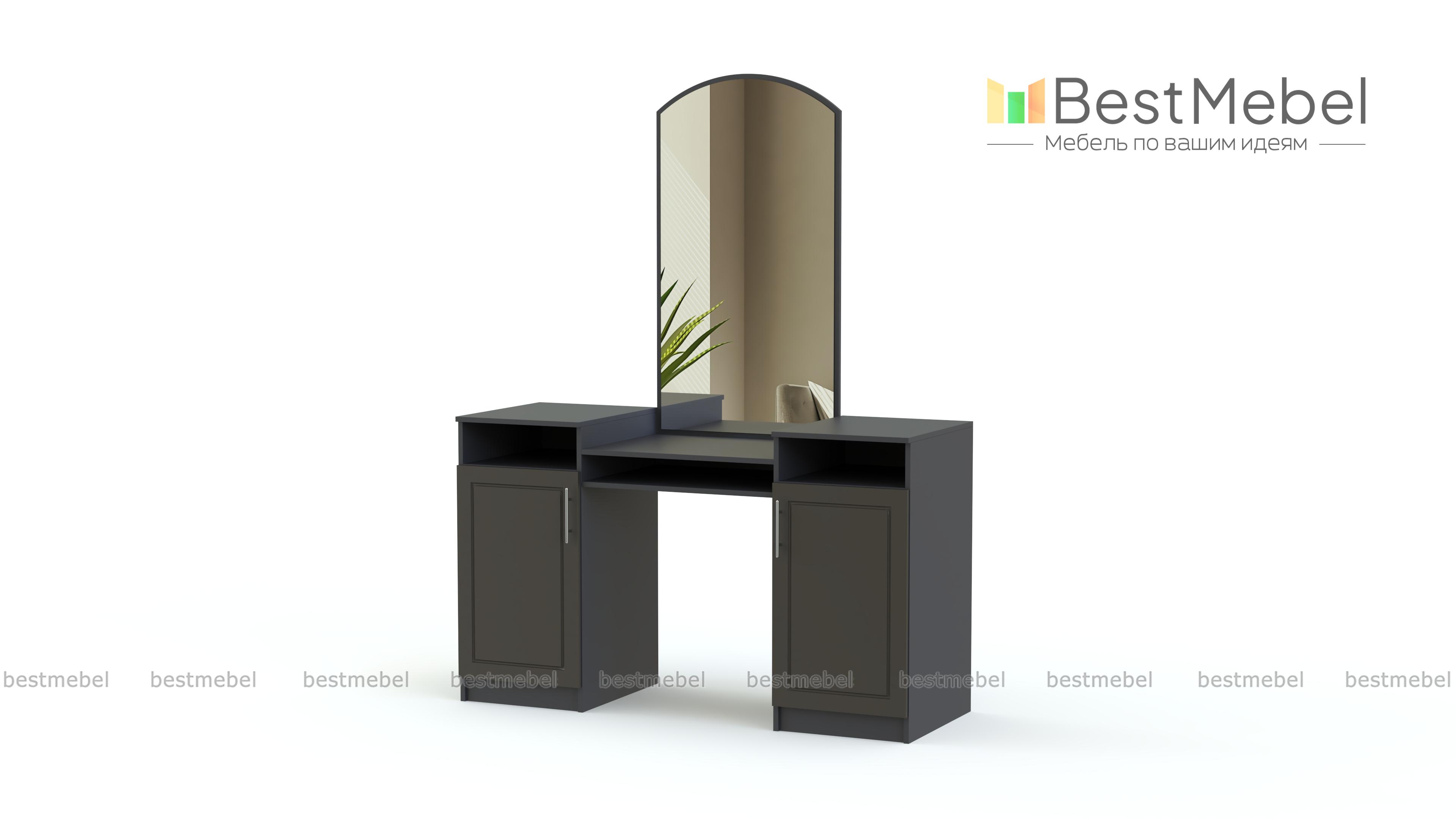 Отличное дополнение к спальному гарнитуру, которое создано красивым, для того чтобы Вы сами смогли стать немного красивее. Купить стол туалетный Джорджия СБ-1144 BMS стоит в спальню любого размера, для того чтобы иметь личное пространство для косметических процедур. В этом поможет великолепное просторное зеркало, которое располагается в центральной части над эргономичной столешницей. По бокам располагается пара шкафчиков с закрытыми полками. Распашные дверцы оборудованы привлекательными ручками, над дверцами располагаются открытые полки.