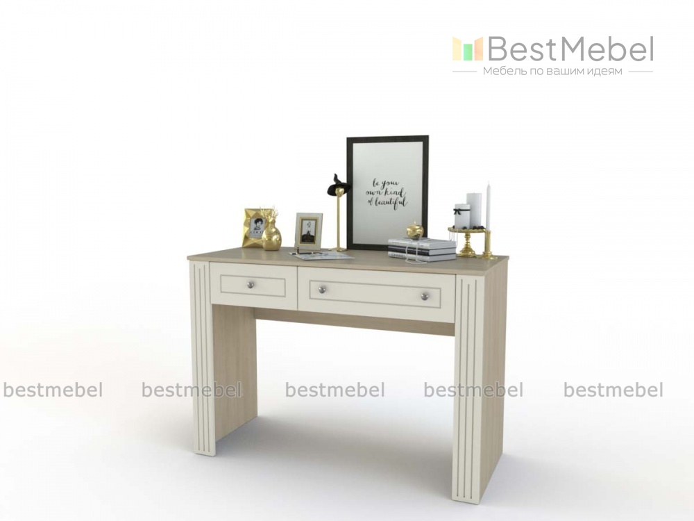 Стол туалетный Камилла 7 BMS дополнит меблировку уютной спальни с элементами стиля прованс. Выполненный в светлых тонах, столик декорирован по фасаду фрезеровкой и дополнен миниатюрными ручками-кнопками. Для удобного хранения разнообразных средств по уходу, украшений и аксессуаров конструкцией предусмотрены два выдвижных ящика разных размеров и классическая прямоугольная столешница. Купить стол туалетный Камилла 7 BMS приглашаем к нам в интернет-магазин по приятной цене.