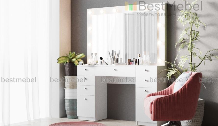Туалетный столик Гласс 8 BMS обеспечит комфортные условия для нанесения макияжа и хранения уходовых средств. Вместительная двухтумбовая модель оборудована выдвижными ящиками разных размеров и широкой столешницей, на которой закреплено большое горизонтальное панно с зеркалом. По периметру зеркала располагаются встроенные лампочки. Исполнение в белом цвете универсально и позволит гармонично вписать столик в современный интерьер. Купить туалетный столик Гласс 8 BMS приглашаем в наш интернет-магазин.