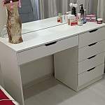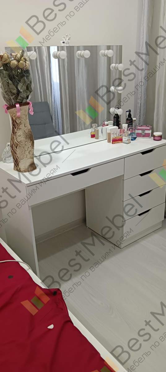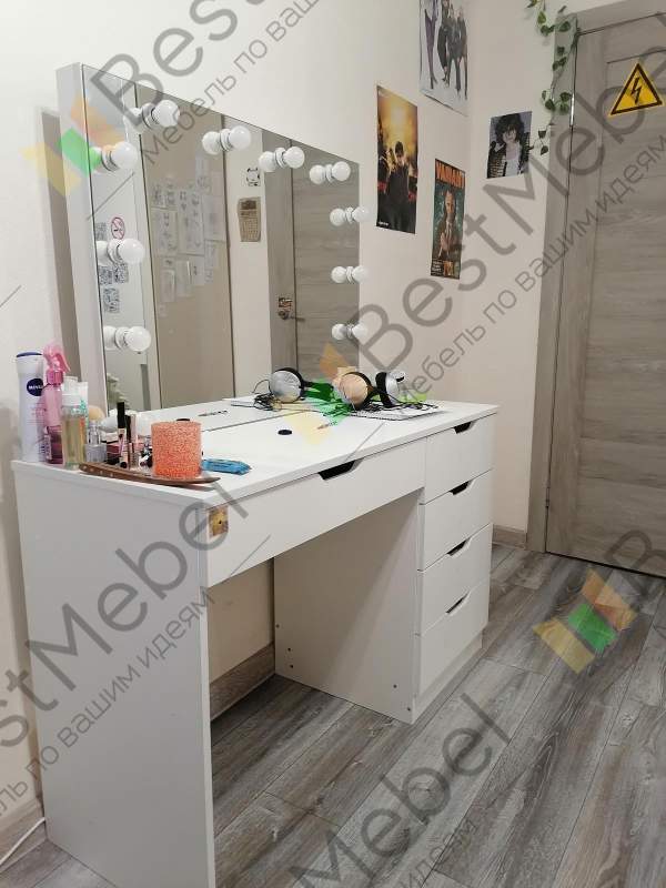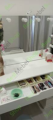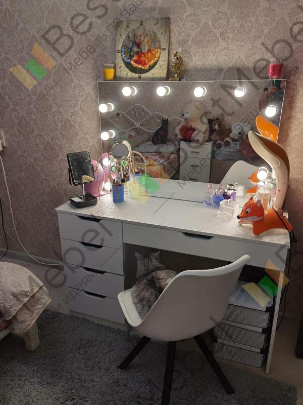 Заказ 832538. Столик брали девочке подростку, она в восторге, очень светло, краситься ей очень удобно, но при этом она за ним и уроки делает и полочки и для косметики и для учебников, место для хранения много. Привезли с разбитым зеркалом, но очень оперативно привезли новое. Лампочки и все что надо в комплекте.