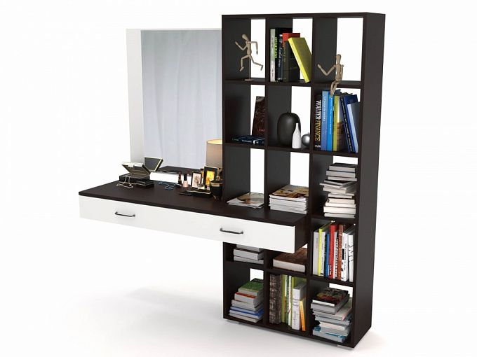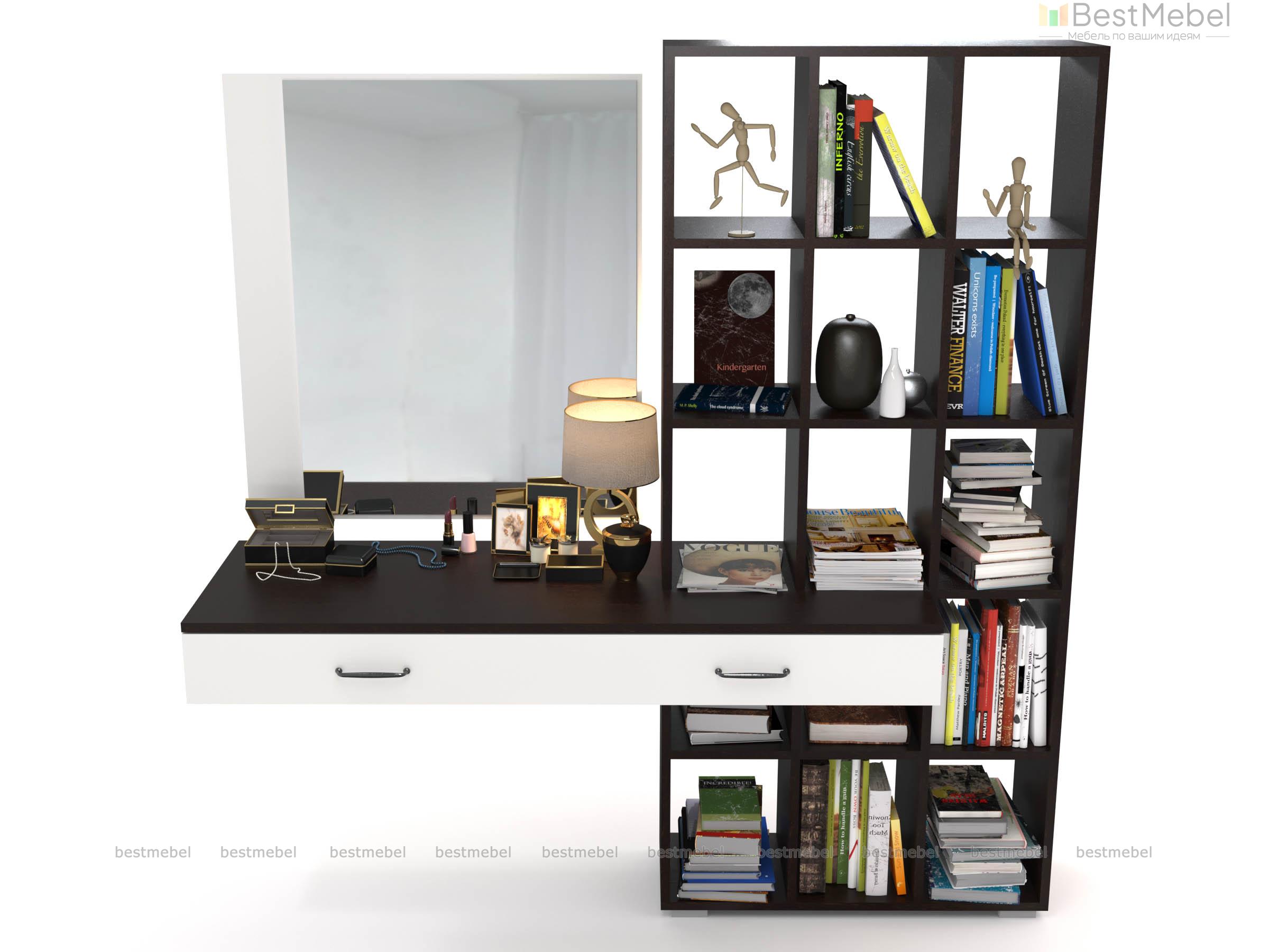 Большой вместительный комплект, объединяющий туалетный столик и стеллаж, подойдет не только для спален, но и для гостиных или прихожих. В стеллаже на пятнадцать полок разместятся книги, предметы декора, фотографии и прочие уютные домашние мелочи. Столешница представляет собой секцию с просторным выдвижным ящиком для косметики и средств ухода. Дополняет туалетный столик Модерн BMS большое зеркало навесного типа, с которым ваша прическа всегда будет идеальной.