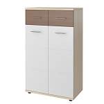 Тумба для обуви Оскар 9 BMS – вместительная модель, которая сможет разместить не только сезонную обувь, но и средства по уходу. Модель оборудована просторной столешницей, удобной для мелочей, двумя выдвижными ящиками под аксессуары и распашным отделением с полками внутри. Выполненная в сочетании древесных тонов и белого с горизонтальной фрезеровкой, тумба смотрится особенно актуально. Купить тумбу для обуви Оскар 9 BMS по лучшей цене приглашаем в наш интернет-магазин.