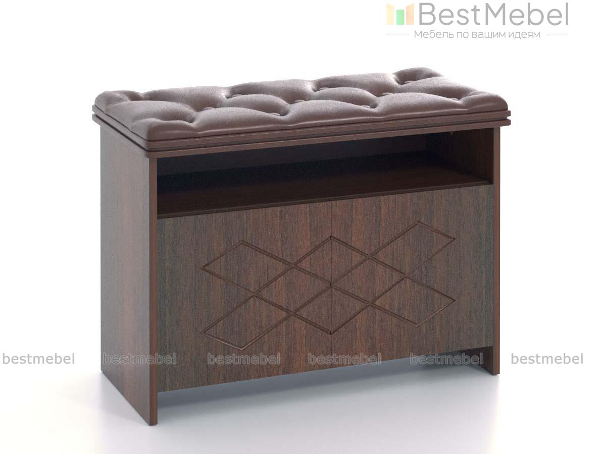 Тумба для обуви с сиденьем Kanes 4 BMS отличается уютным и респектабельным классическим дизайном. Модель выполнена в сочетании насыщенных древесных тонов с шоколадной экокожей в каретной стяжке, фасад декорирован фрезерованным рисунком. Удобное размещение обуви и аксессуарам обеспечат глухое отделение и просторная ниша, а мягкая обивка позволяет использовать тумбу в качестве сиденья. Купить тумбу для обуви с сиденьем Kanes 4 BMS по выгодной цене приглашаем в наш интернет-магазин.