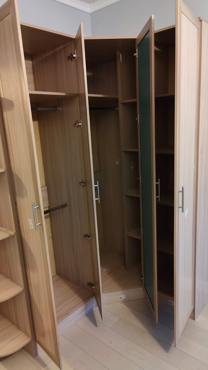Хороший и вместительный шкаф. В качестве углового не бросается в глаза в комнате, оптимально распределены полки и штанги внутри.  Качество товара отличное, единственное что отметил бы - все заказывали в одном цвете, но рамки дверей по тону все-таки отличаются. Момент не критичный, но тем не менее)Детали заказа обсуждали со специалистом в магазине, расположенном в бц Румянцево. Все пожелания были учтены, необходимые изменения оперативно согласованы.