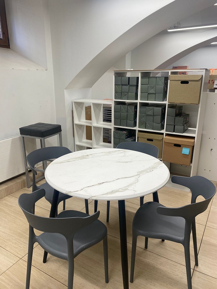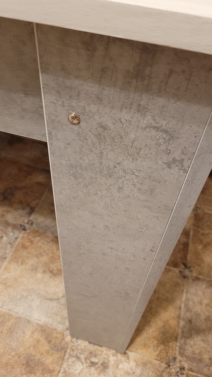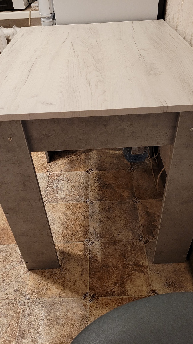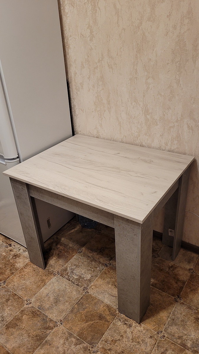 Заказ 00000756581.Переехала, и нужны были на кухню новый стол и тумбочка. Хотелось, чтобы они сочетались между собой и с уже имеющимся кухонным гарнитуром, и при этом по размеру подходили. Стол был нужен небольшой, 90×70см. Поэтому решила заказать в Бестмебель, т.к знала, что можно сделать как в конструкторе всё под свои хотелки. Изготовили всё быстро, привезли в срок.Пользуюсь третий месяц, нареканий нет. Столешницу выбрала из МДФ. Она у меня светлая, но легко протирается обычной влажной кухонной тряпочкой.Единственное, с чем не совсем угадала - что ножки "уголком" гораздо сильнее сужают пространство для сидения, когда задвигаешь стул, чем я думала.  Для женщины среднего телосложения - пойдет, но бедра оч плотно соприкасаются с ножками стола, если задвинуть стул. Сильно долго не просидишь, поэтому обычно потом отодвигаюсь.Сборщика вызывала не от Бестмебель, т.к.у меня уже был свой проверенный мастер. В комплекте был крепёж. Но мастер сказал, что одни из болтов были слишком короткие. Он мне их заменил, так что для меня это не стало проблемой.С учетом цены и моей задачи, в целом отличный вариант!