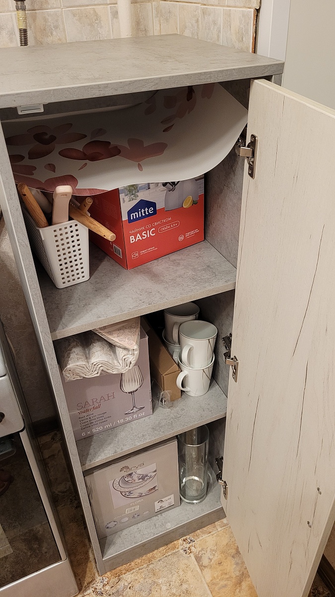 Заказ 00000756582.Переехала, и нужны были на кухню новый стол и тумбочка. Хотелось, чтобы они сочетались между собой и с уже имеющимся кухонным гарнитуром, и при этом по размеру подходили. Тумбочка нужна была узкая и не слишком глубокая, и при том определенной высоты - чтобы влезла между плитой и окном в угол.Поэтому решила заказать в Бестмебель, т.к знала, что можно сделать как в конструкторе всё под свои хотелки. Изготовили всё быстро, привезли в срок.Пользуюсь и радуюсь! Очень удобная, по размерам встала идеально! Ничего не скрипит, глаз радует, и очень много всего вмещает))