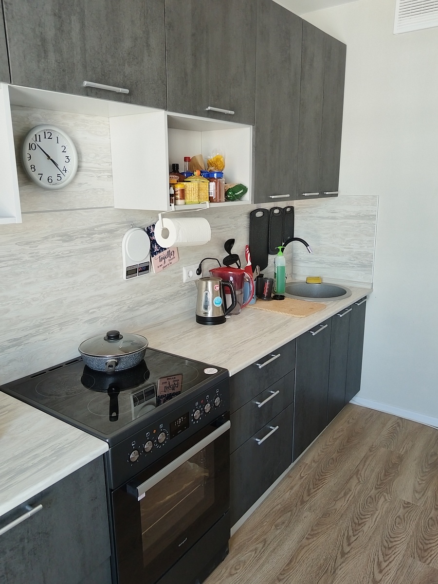 Очень довольна заказом! Кухня понравилась внешне, установили полтора месяца назад, все детали пришли целые, без сколов, полный комплект креплений и фурнитуры. Проект кухни с учетом моих пожеланий менеджер сделал в тот же день. Обещали что кухня будет готова через две недели. В итоге уже через 10 дней позвонили согласовать время доставки. Привезли во время и быстро подняли на этаж, удобная оплата по QR коду. Ну и очень приятная цена без потери качества порадовала. Заказ 00000715005, изделие ЭСКИЗ №00000715005 Кухня Техно Нью 3,4 BMS (3300х2370х600)