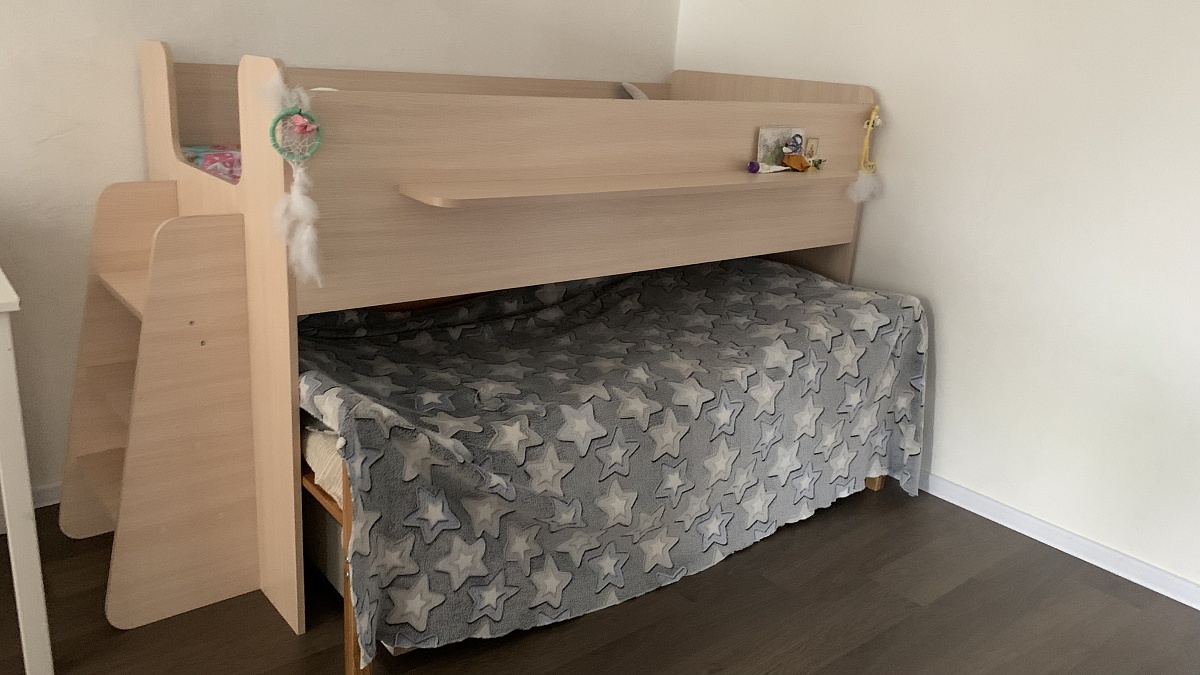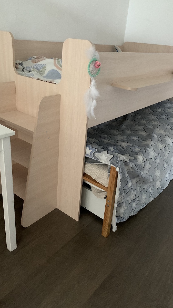 Думали заказывать двухэтажную кровать, но нашли самый удачный вариант от компании Best Mebel. У нас кровать МИФ23 - выглядит, как двухэтажная, но внизу можно ставить другую кроватку, а впоследствии стол и пр. Получается более расширенный функционал на будущее, когда дети разъедутся по своим комнатам. Места занимает мало, удобная, надёжная и смотрится аккуратно. Моя благодарность производителям!№00000658128