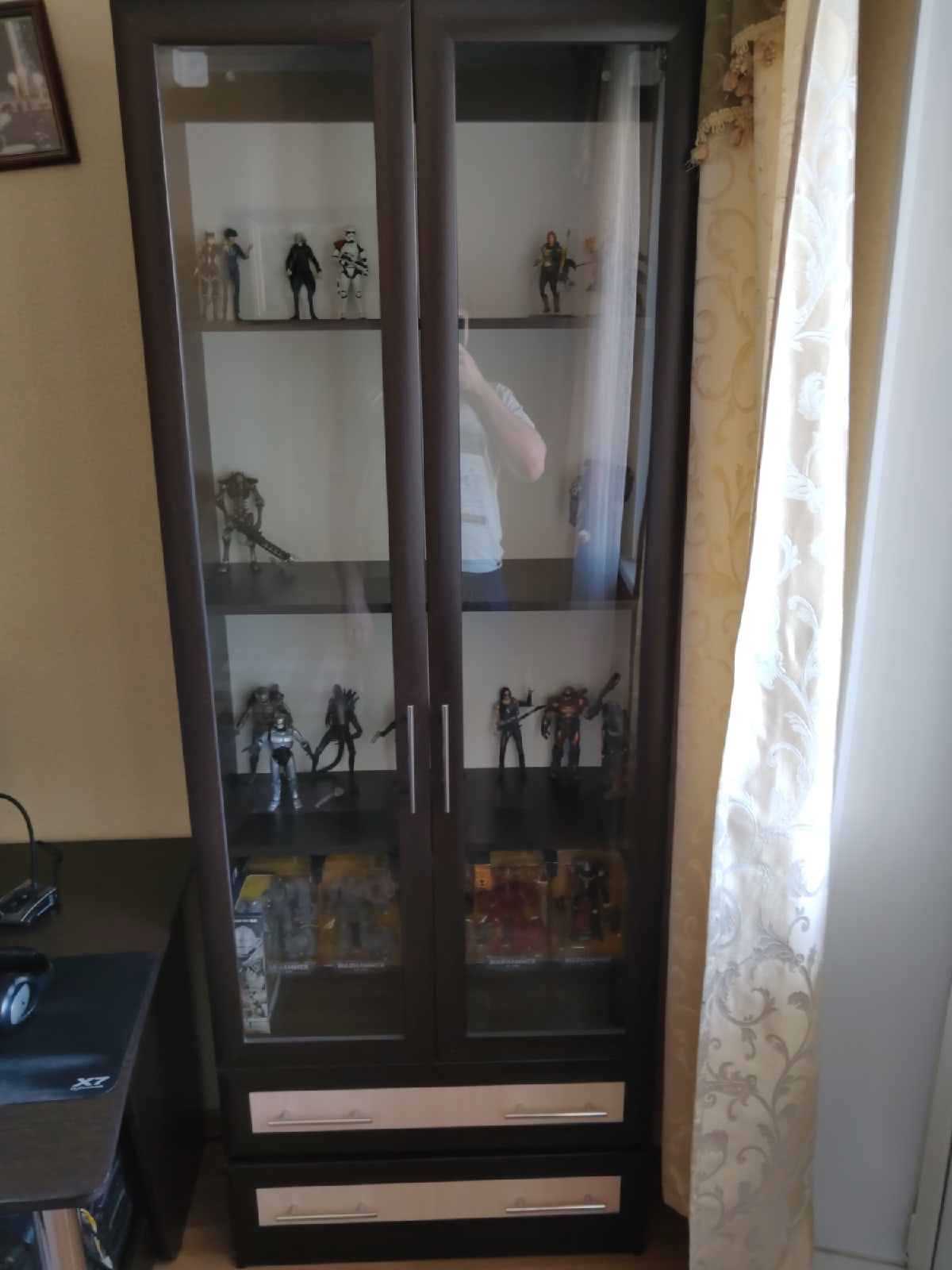 Пользуюсь шкафом более 2х недель. Покупал стандартный вариант (800х2200х320).  Доставили без проблем. Собирал сам. Стекла чистые без царапин, не скрипит не шатается, для меня это было важно так как планировал в него ставить не самые устойчивые вещи. Приятный дизайн. Своей покупкой доволен.