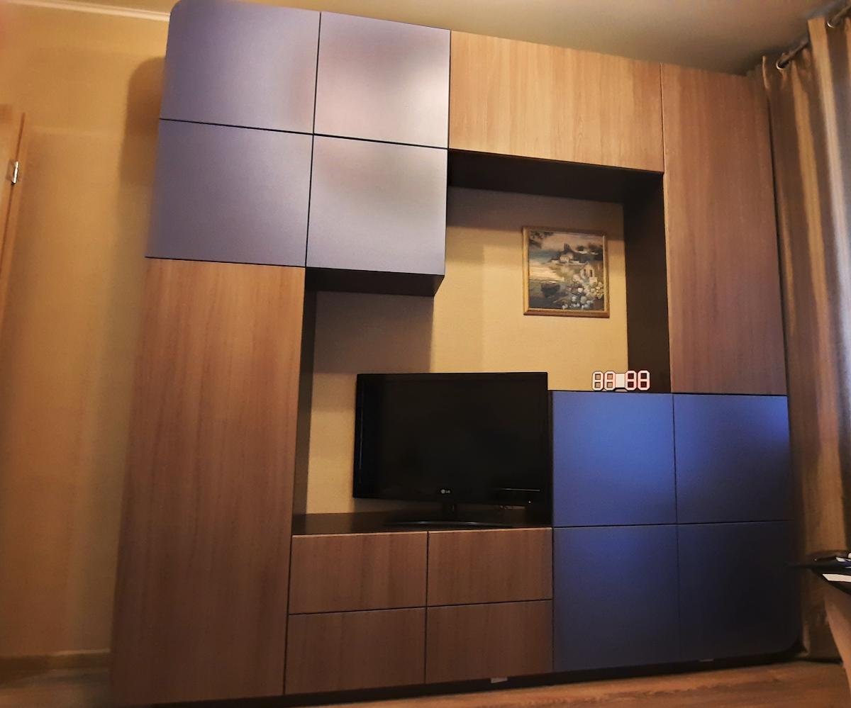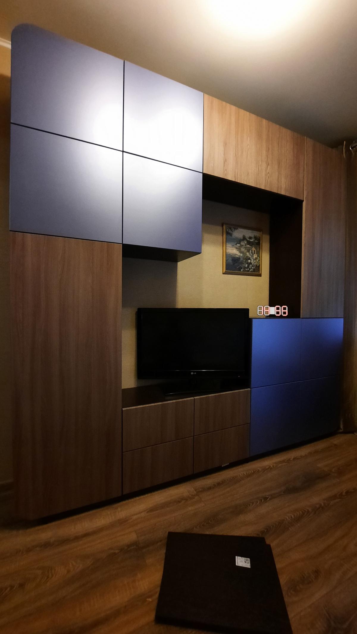 Стенка очень красивая, размеры 2400×2400×350, цвет выбрали корпус Венге, фасад Ясень шимо тёмный, дополнительный цвет Голубой металл
