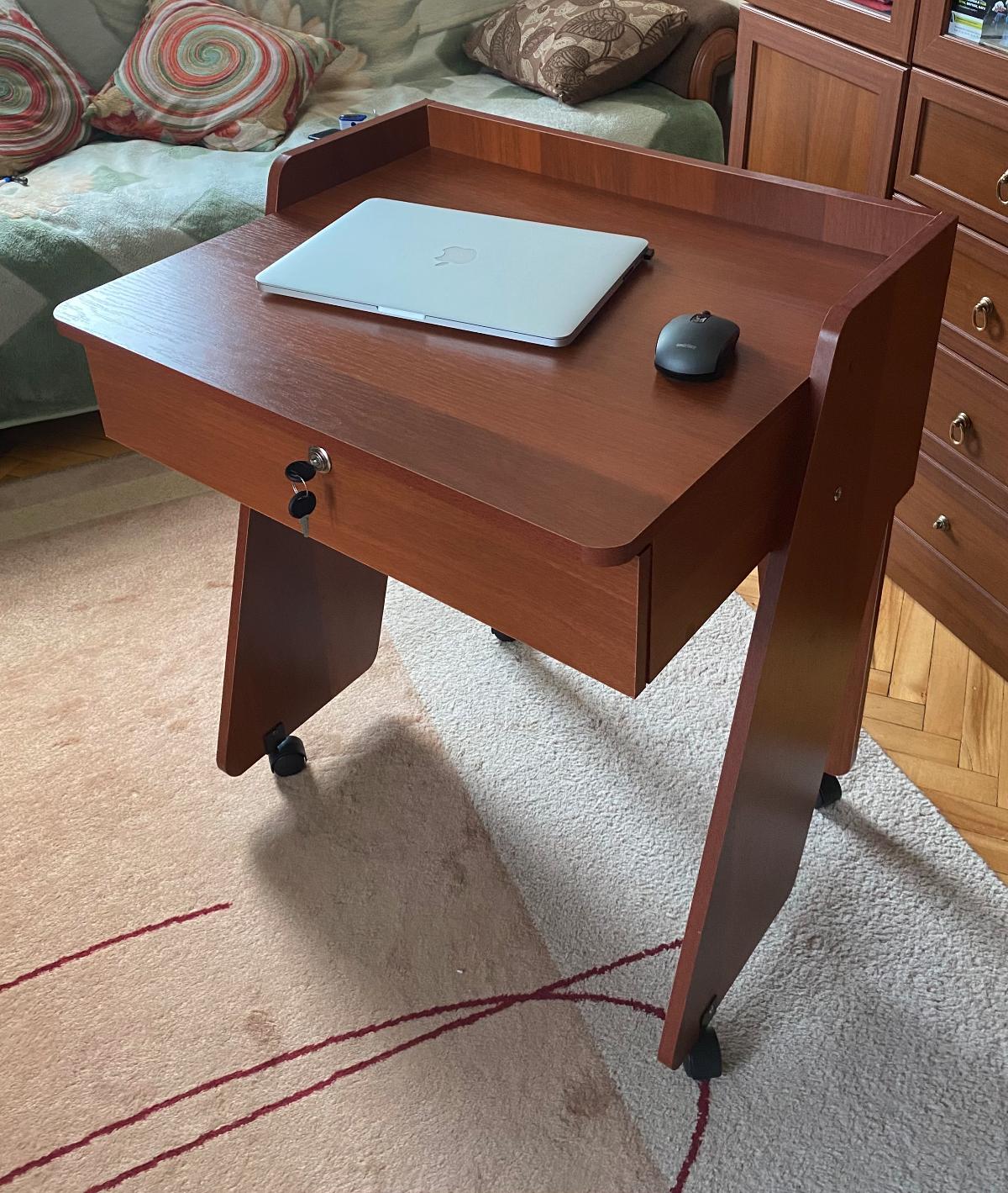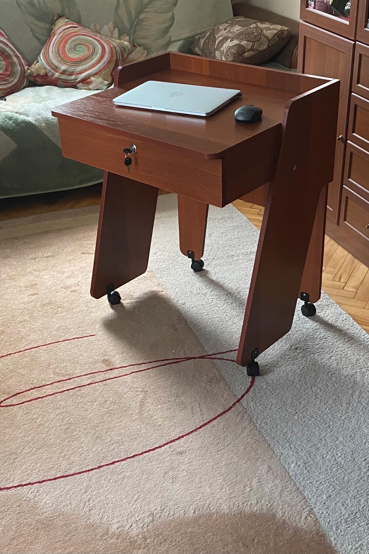 Очень неплохой малогабаритный столик для ноутбука. Покупала для временной удаленной работы. Удобно, что на колесиках, и можно передвигать в любое место. Очень полезно, что есть выдвижной ящик. И цвет под мебель можно было подобрать.