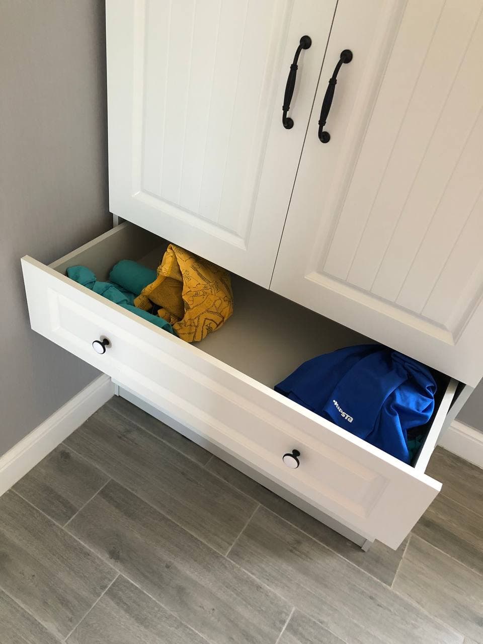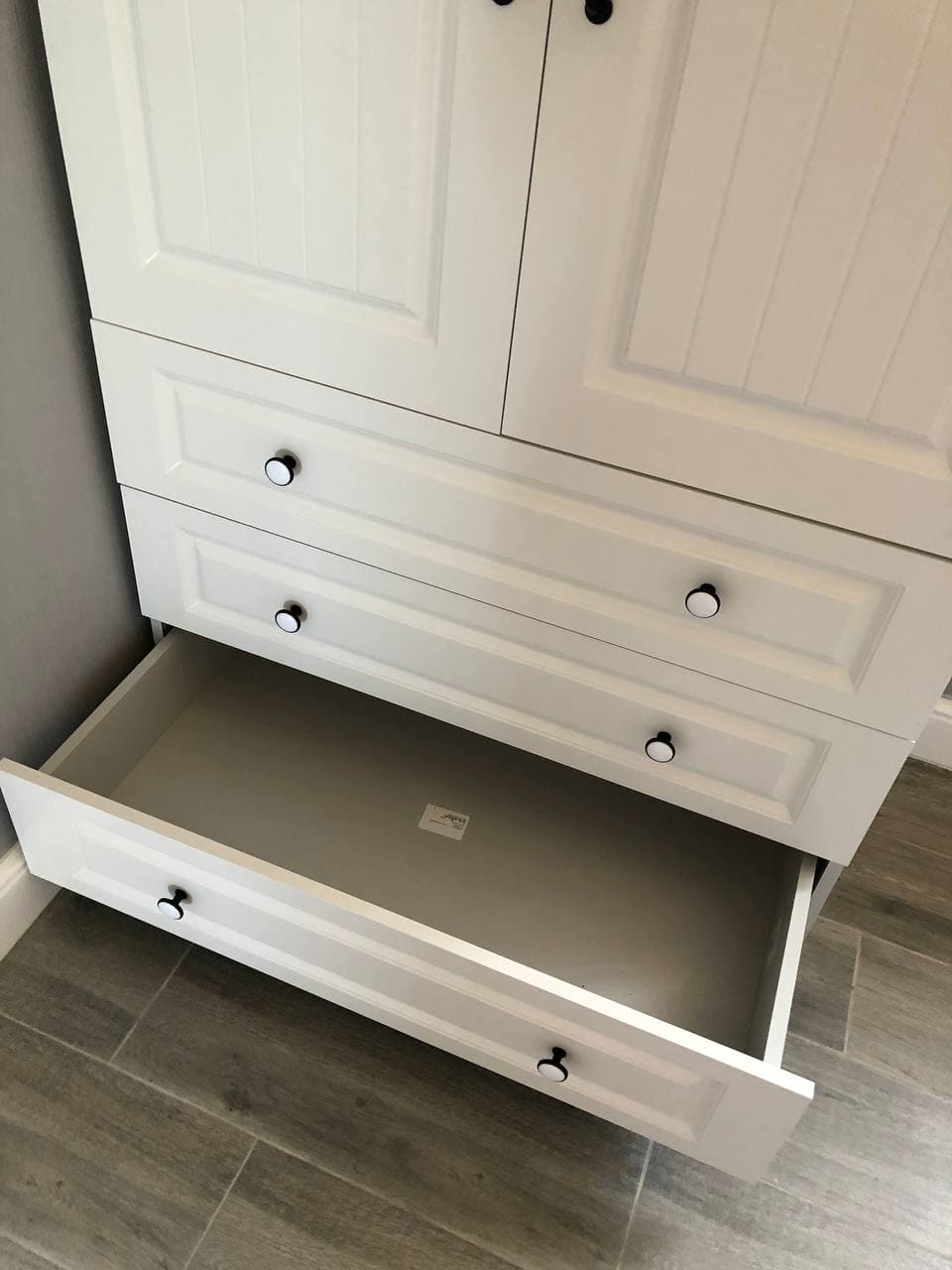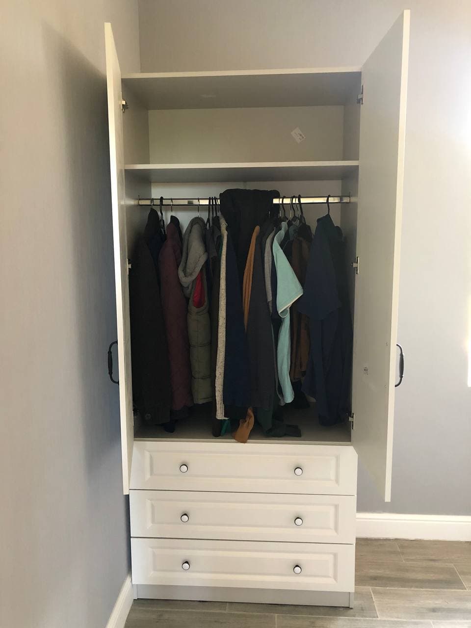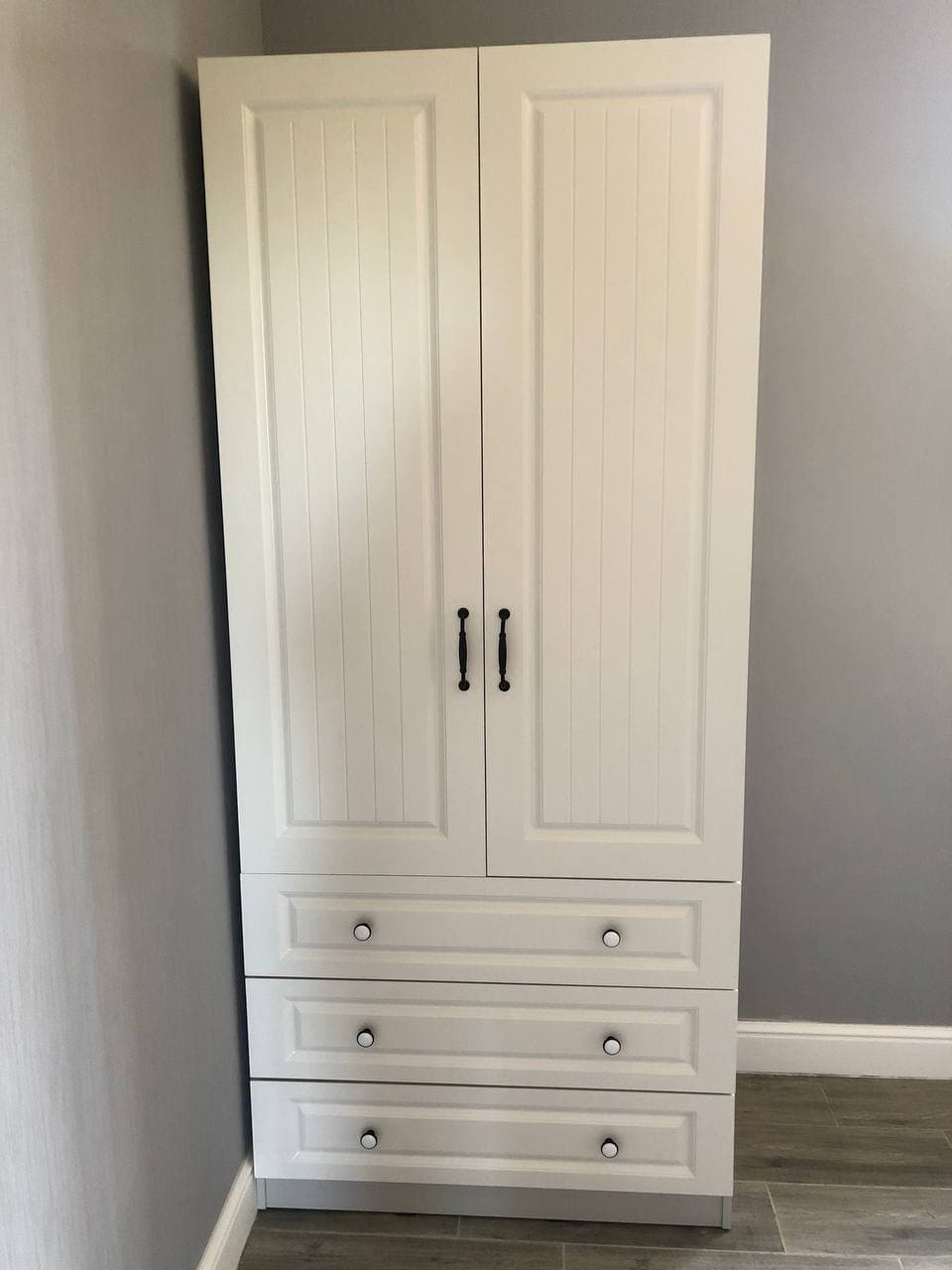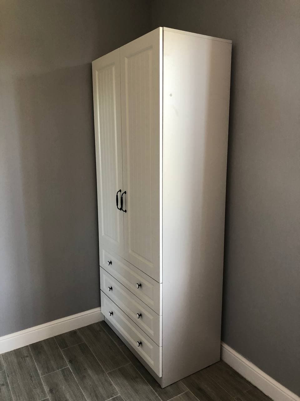 Заказ 00000681637, изделие ЭСКИЗ №00000681637 Распашной шкаф Прага 905 BMS (900х2065х500)Брал этот шкаф для моего гардероба. Модель понравилась тем, что есть три ящика внизу – ты получаешь и шкаф для рубашек и брюк, и комод для вещей, которым не нужна вешалка. Наверху удобно хранить головные уборы и шарфы.Про качество: оно очень крутое! Выбрали покрытие фасадов «структура дерево белый» по фото и не прогадали – выглядит очень реалистично, реально как будто массив дерева покрасили в белую эмаль.Доставка быстрая – меньше, чем за неделю, до подъезда в Воронеже, совершенно бесплатно. Детали шкафа из МДФ и ЛДСП упакованы в картонные коробки, фасады между собой проложены пенной плёнкой. Штанга была в стейтч-плёнке, куча слоёв. Фурнитура лежала в черном пакете, все детали под расчёт – всего хватило, лишних не было. Сколов и прочих дефектов не было.Сборка лёгкая, несмотря на непошаговую инструкцию. Просто на каждой детали были наклейки (при сборке мебели других производителей приходилось рулеткой замерять детали, чтобы понять, где какая). Все детали между собой крепятся одинаково – евровинтами (конферматами), не важно, в каком порядке. (Совет: запаситесь электрической отвёрткой, дело пойдёт быстрее). Фурнитура в базовой комплектации не дешевая – вся металлическая + деревянные шканты. Пластика нет даже у минификсов, как бывает у других фабрик. Пластиковые были только подпятники, чтобы шкаф скользил по полу, когда его двигаешь. Петли, которые были в комплекте, прочные, их легко регулировать.Оператор интернет-магазина по телефону согласовал со мной все детали заказа по цвету, фрезеровке и фурнитуре. Я попросил не делать присадку для ручек, так как собирался ставить свои. Все пожелания учли, спасибо! Цена, качество – всё отлично, смотреть на шкаф очень приятно, пользоваться – одно удовольствие.