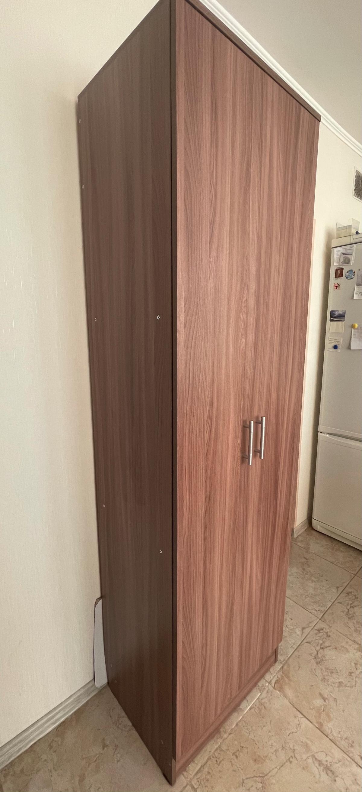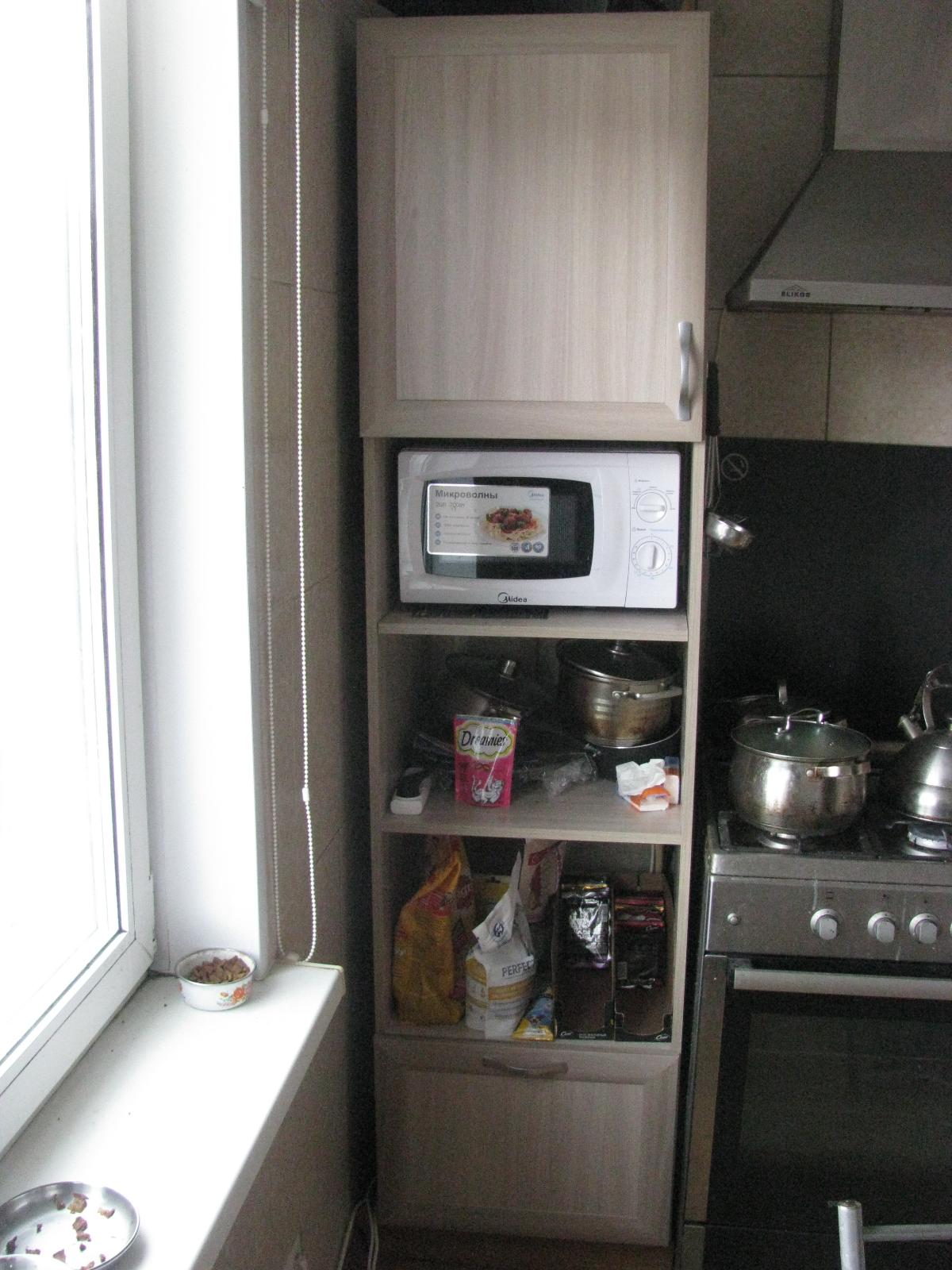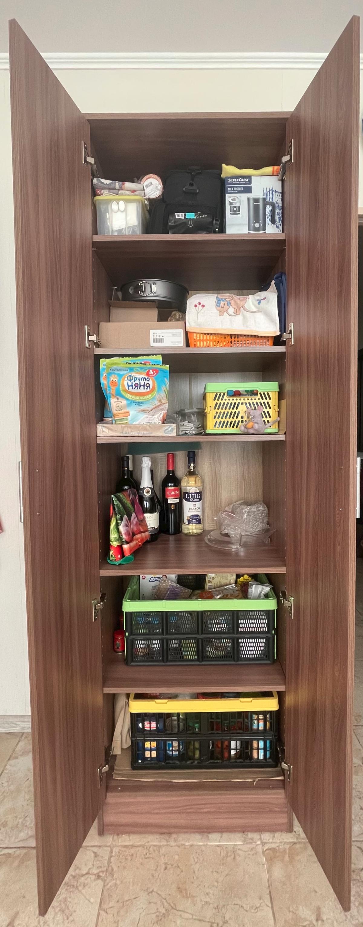 Заказан стандартный шкаф, используется на кухне как дополнительный шкафчик. Дополнительно сделали перфорацию, что позволило сместить подвижные полки под удобную высоту. Можно было заказать дополнительную полку, так ещё удобнее!