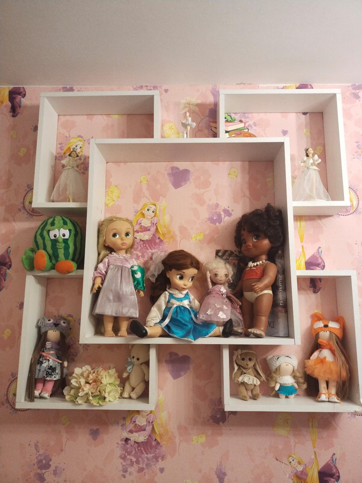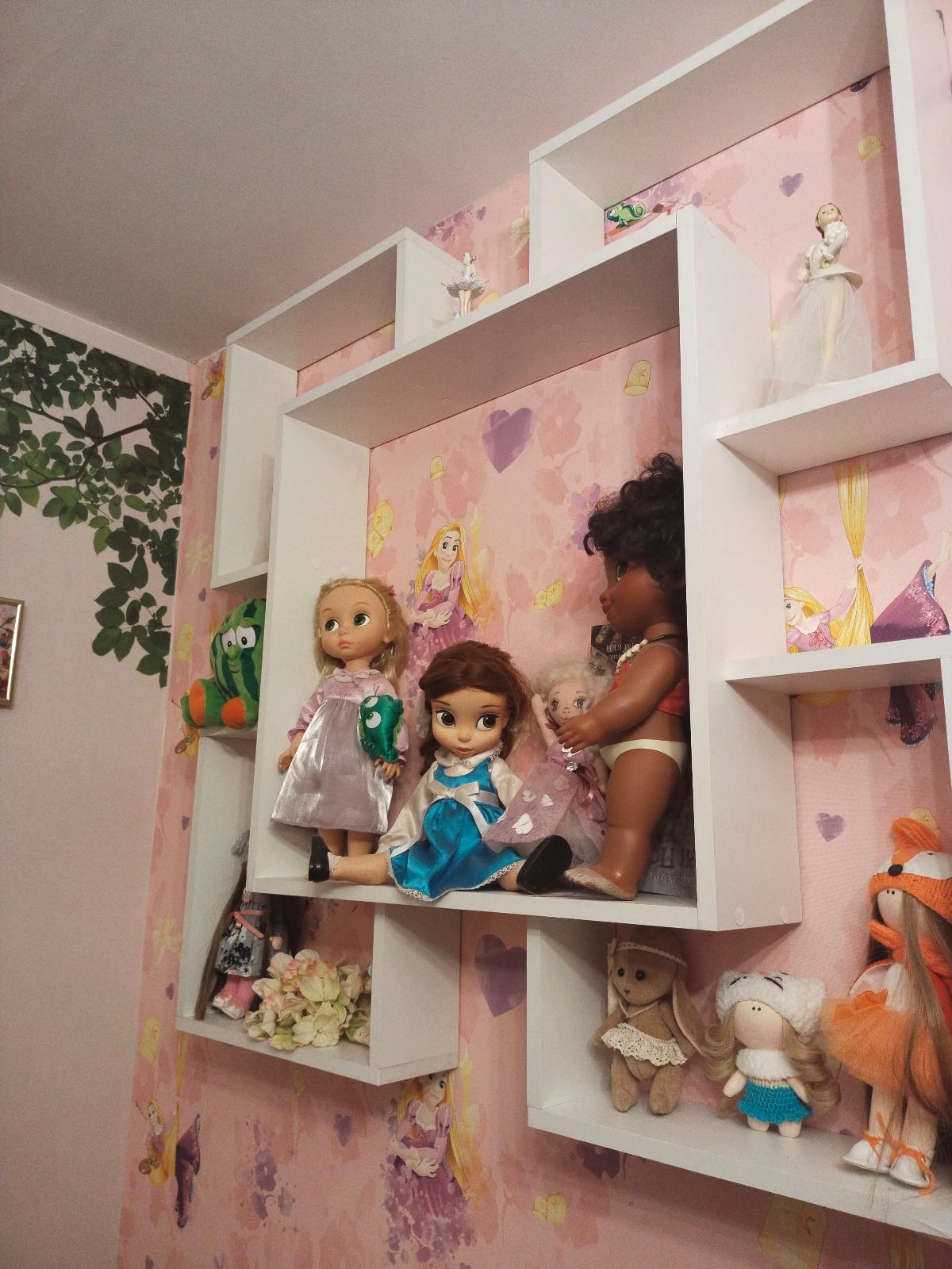 Хорошая красивая полка! Легко собирается, замечательно вписалась в интерьер! Подобрали по цвету к детской мебели. Не громоздкая! Помимо украшения стены, хорошая функциональность! Игрушки замечательно расположились на ней и не валяются больше где попало, а украшают комнату!