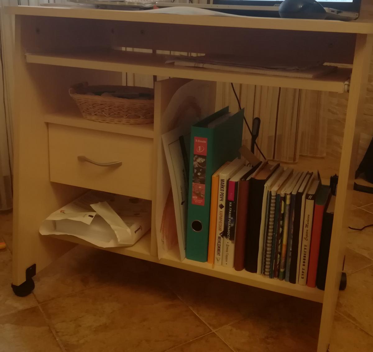 На Новый год сделали себе подарок - заказали этот столик. Удобно, что здесь на сайте можно смоделировать свой, индивидуальный столик, подходящий тебе по цвету и размерам. Решили сделать чуть подлиннее, чем стандартный. Теперь на нем можно одновременно и поработать, и чай попить - места предостаточно. А вечером легким движением руки столик на своих колесиках отправляется спать к стенке. Кстати, очень долго искали такую небольшую модель на колесиках и нигде не могли найти. Спасибо за быстрое и качественное изготовление! Заказ 00000576651, изделие Стол компьютерный Костер 1 BMS (900х750х450).