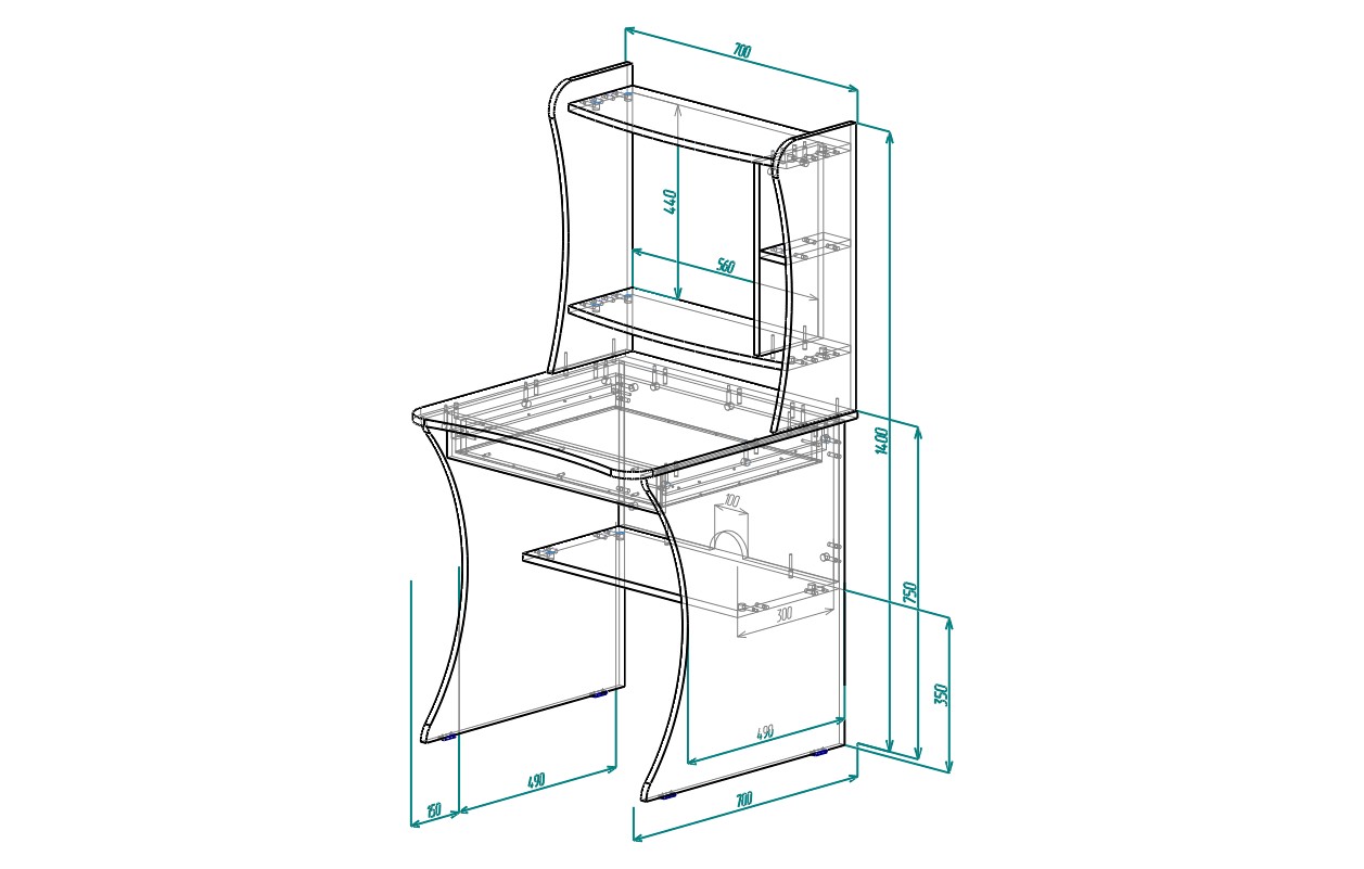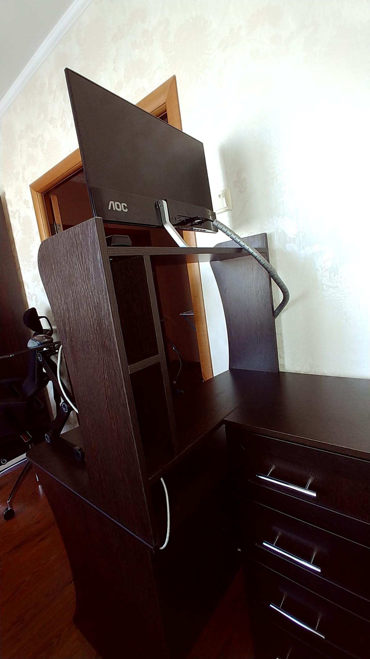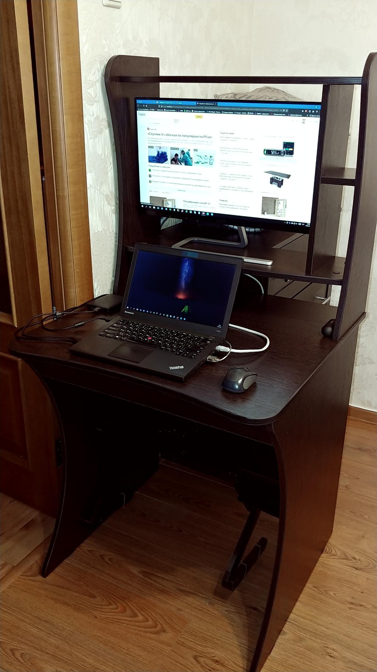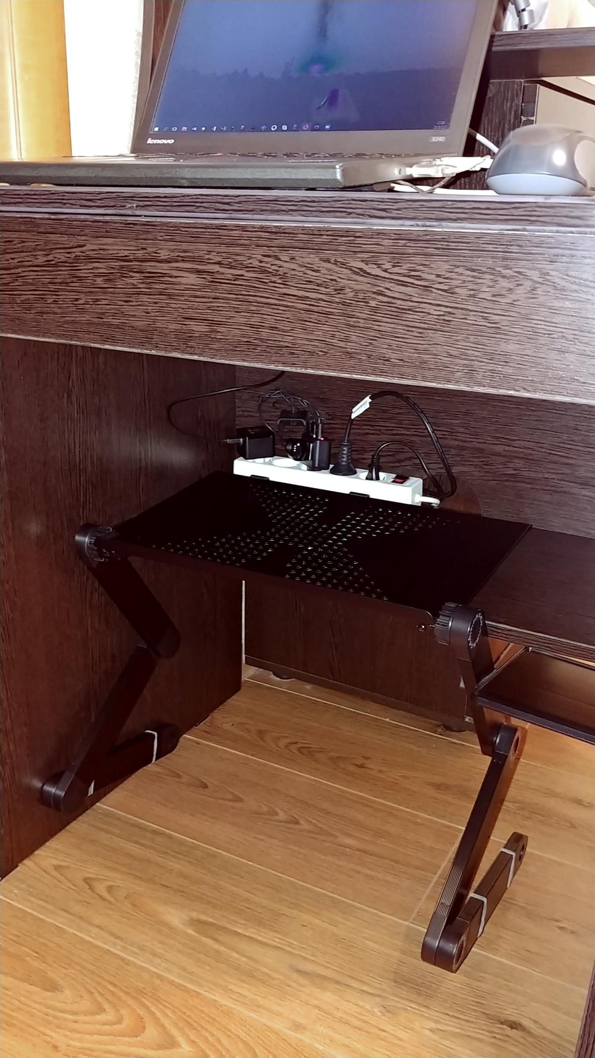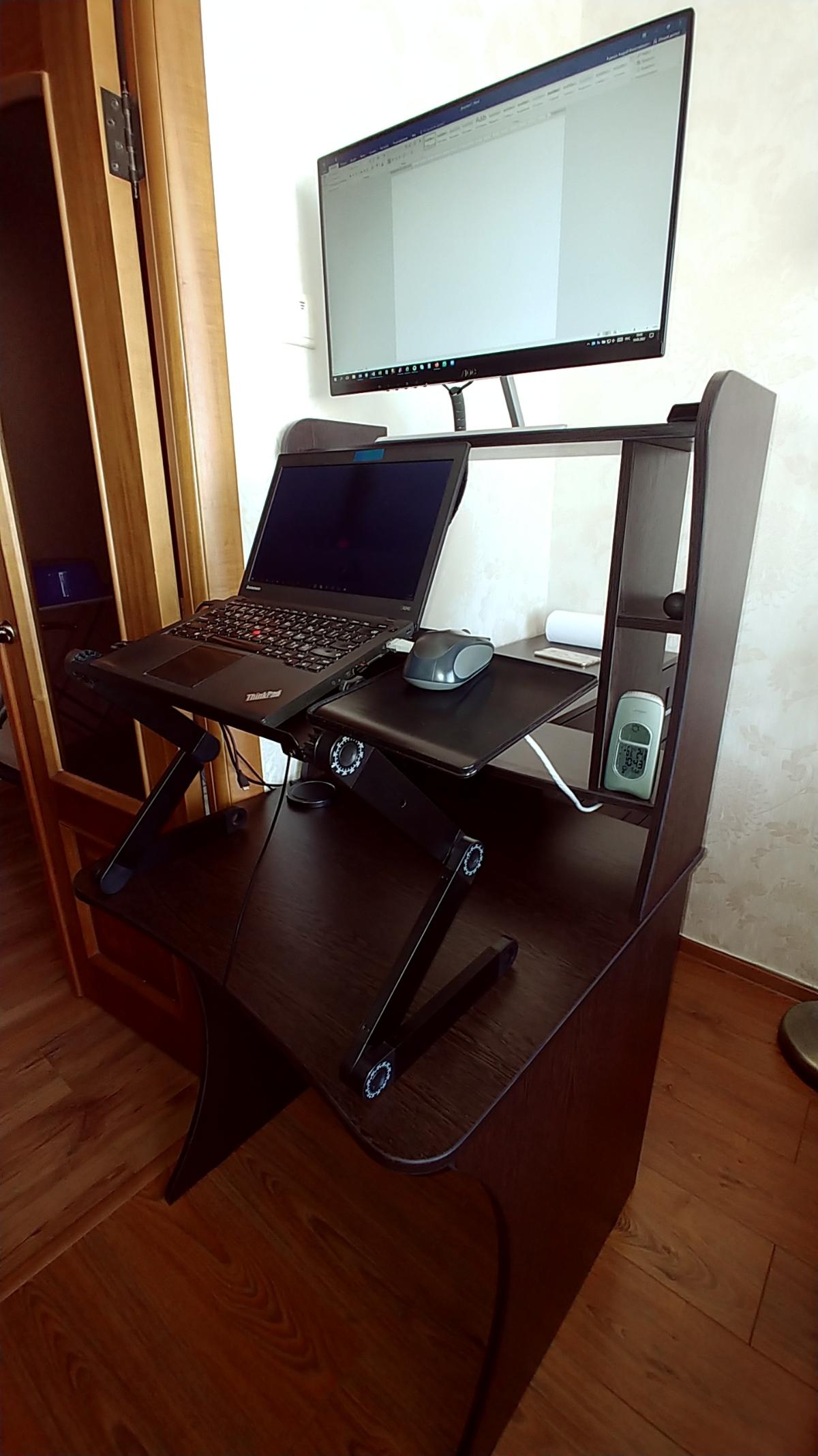 03.2021. На основе этого стола сделал индивидуальный проект для работы сидя-стоя. Получилось порядка 10 тыс. руб. Заменил полку для клавиатуры на ящик, сделал ножки с обратной выпуклостью, чтобы не мешали коленям, добавил полку под столом для отдыха ног, убрал полку для системного блока под столом. Добавил прорезь для сетевого фильтра на задней стенке. Пристройку сделал пониже чтобы ставить на нее монитор при работе стоя. Для роста 172 см высота верхней полки стола должна быть в районе 130 см. У меня получилось 135 см. это высоковато. На Али экспресс заказал подставку для ноутбука за 1,5 тыс. руб.